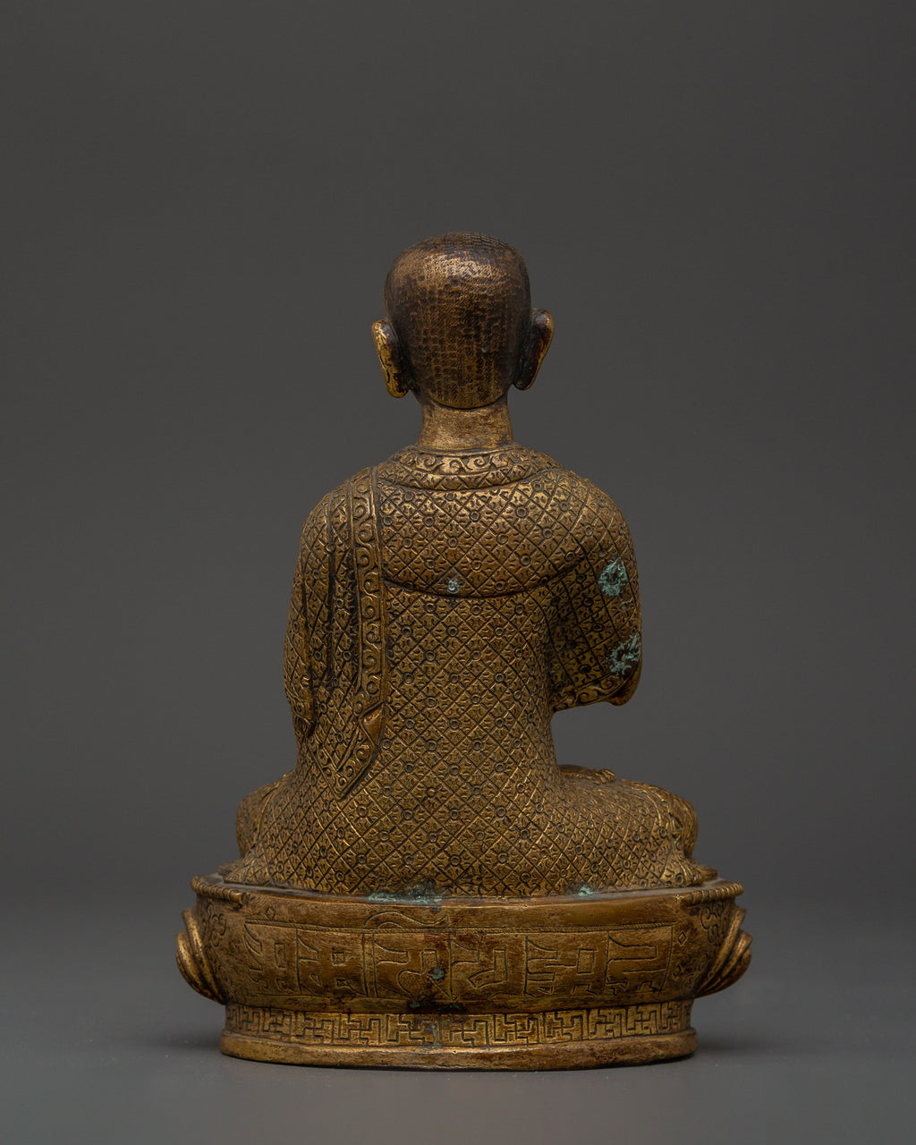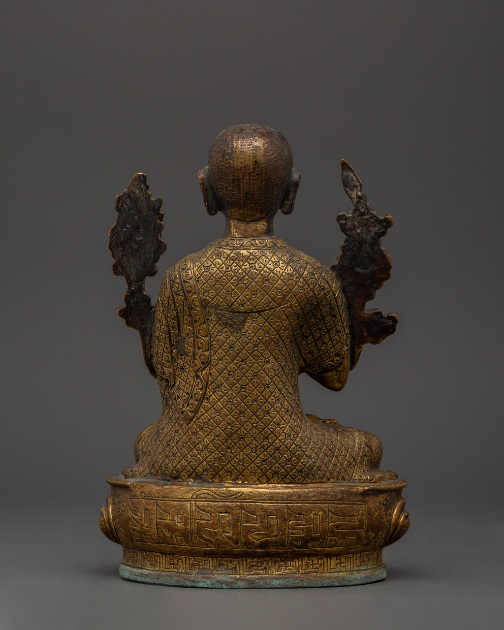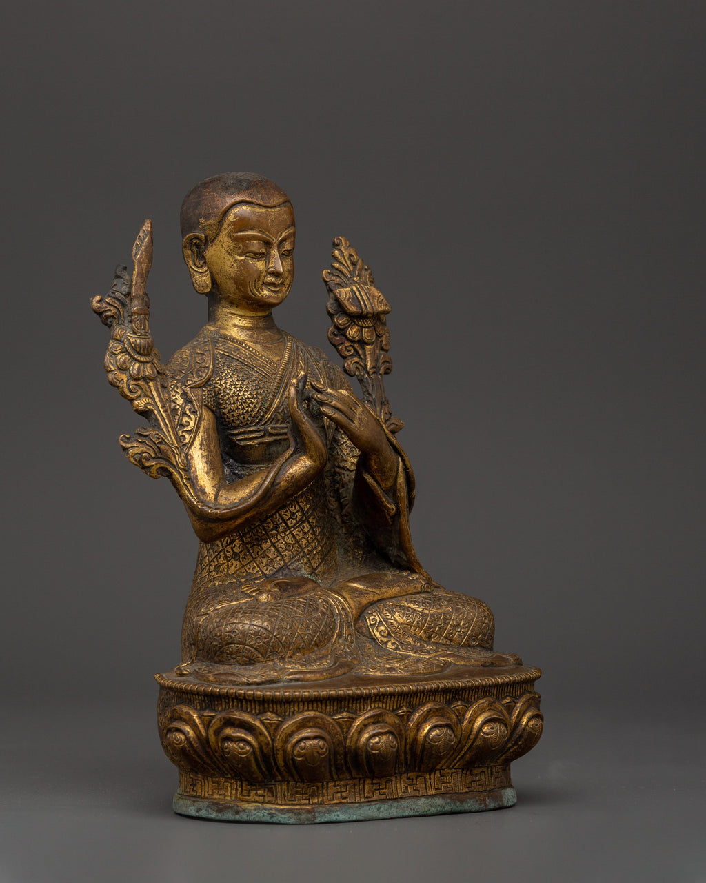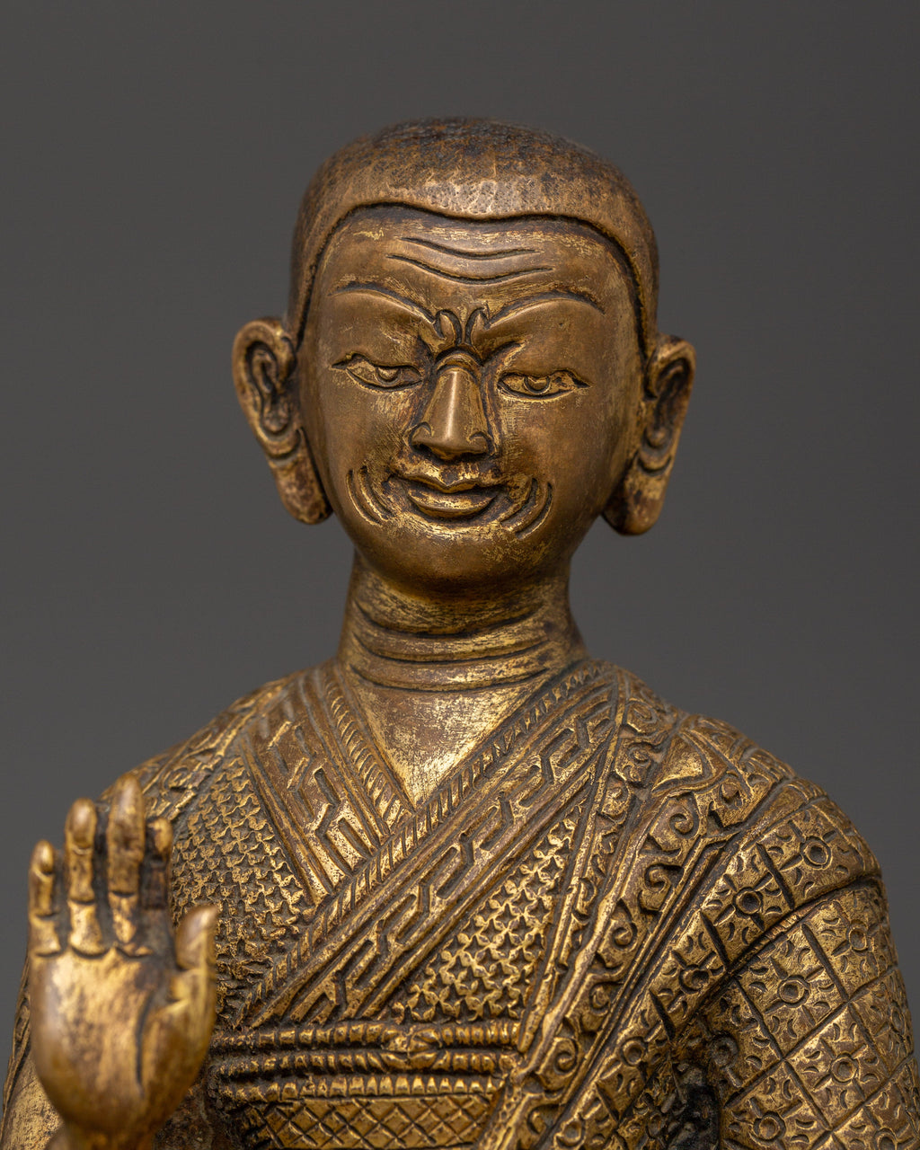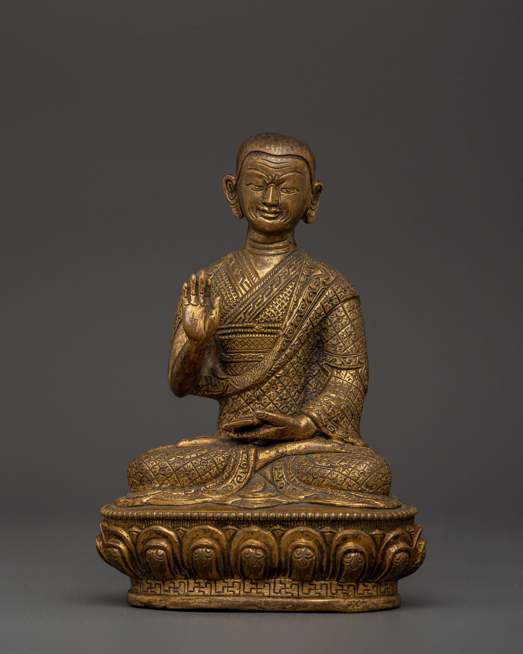 This handcrafted brass body of Tsongkhapa with Je Gyaltsab and Je Khedrup. This breathtaking trio of Tibetan Buddhist monks represents the enlightened heritage of the Gelug faith. In the center is Je Tsongkhapa, the great 14th-century teacher, philosopher, and founder of the Gelug school. Tsongkhapa, renowned for his profound insights, pure ethics, and scholarly teachings, is sometimes regarded as a manifestation of Manjushri, the Bodhisattva of wisdom. His statue is 20.5 cm in height and 14.5 cm in width, and exudes presence and calm. Flanking him are his devoted heart followers, Je Gyaltsab and Je Khedrup, 18 cm tall and 13 cm wide, captured in contemplative silence with hands uplifted in the Abhaya Mudra, representing fearlessness and protection. All three are seated on exquisite lotus moon discs representing purity, enlightenment, and the spiritual path.