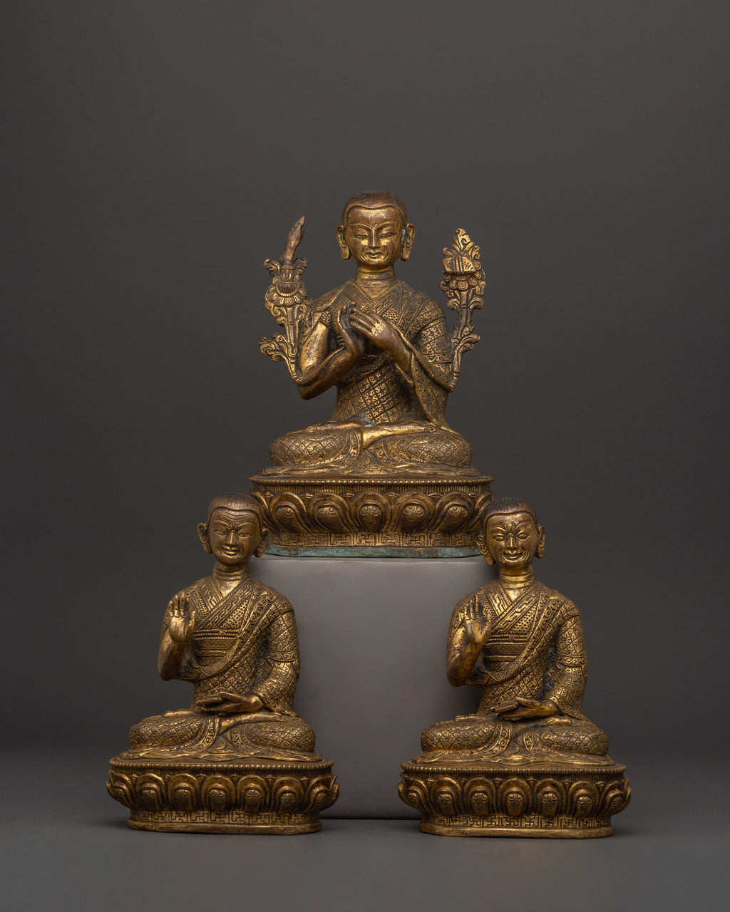 Handcrafted Brass body Tsongkhapa with Je Gyaltsab & Je Khedrup | Tibetan Buddhist Masters Statue Set