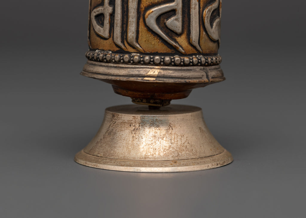 This Tibetan Prayer Wheel is expertly created from brass and copper, reflecting the rich legacy of Himalayan handicraft. The copper inlay adds to its holy appeal by signifying purity and the harmony of body and spirit. Artisans carefully mold and etch each pattern by hand, ensuring that every detail reflects the passion and accuracy of ancient Buddhist workmanship. Its steady spin promotes meditative focus while linking you to centuries of spiritual practice rooted in Tibetan Buddhism.