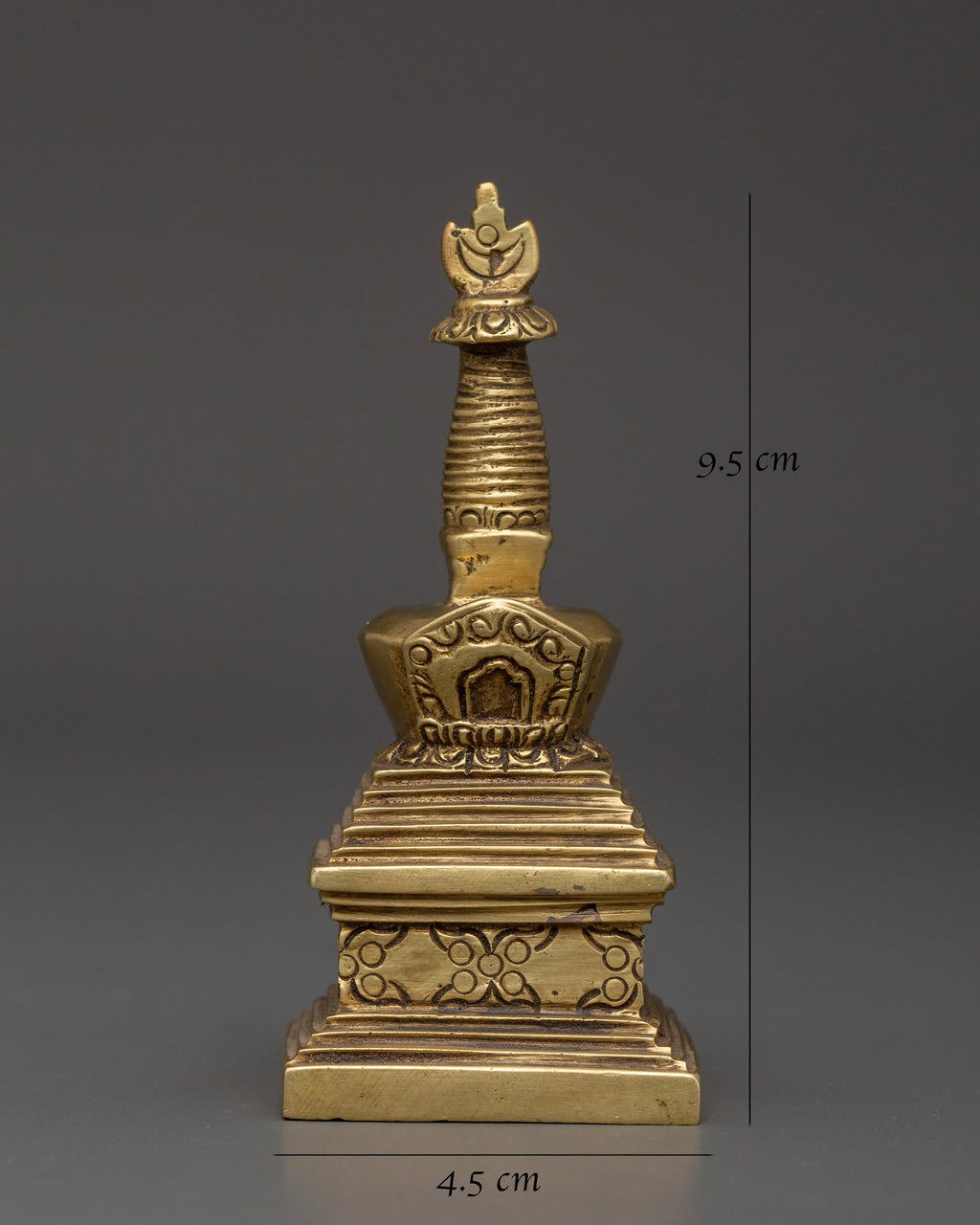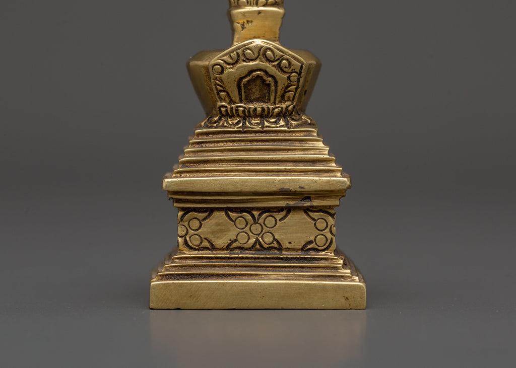 The Brass Stupa is intricately designed with symbolic motifs that reflect Buddhist philosophy. The stupa's layered structure represents the teachings of the Buddha, with the top portion symbolizing the pinnacle of spiritual awakening. The brass body of the stupa is smooth and polished, giving it a timeless appeal that reflects the Buddha's wisdom and compassion. The stupa's base is adorned with intricate carvings, enhancing its aesthetic appeal while symbolizing the foundation of Buddhist teachings and the stability they bring to spiritual practices.
