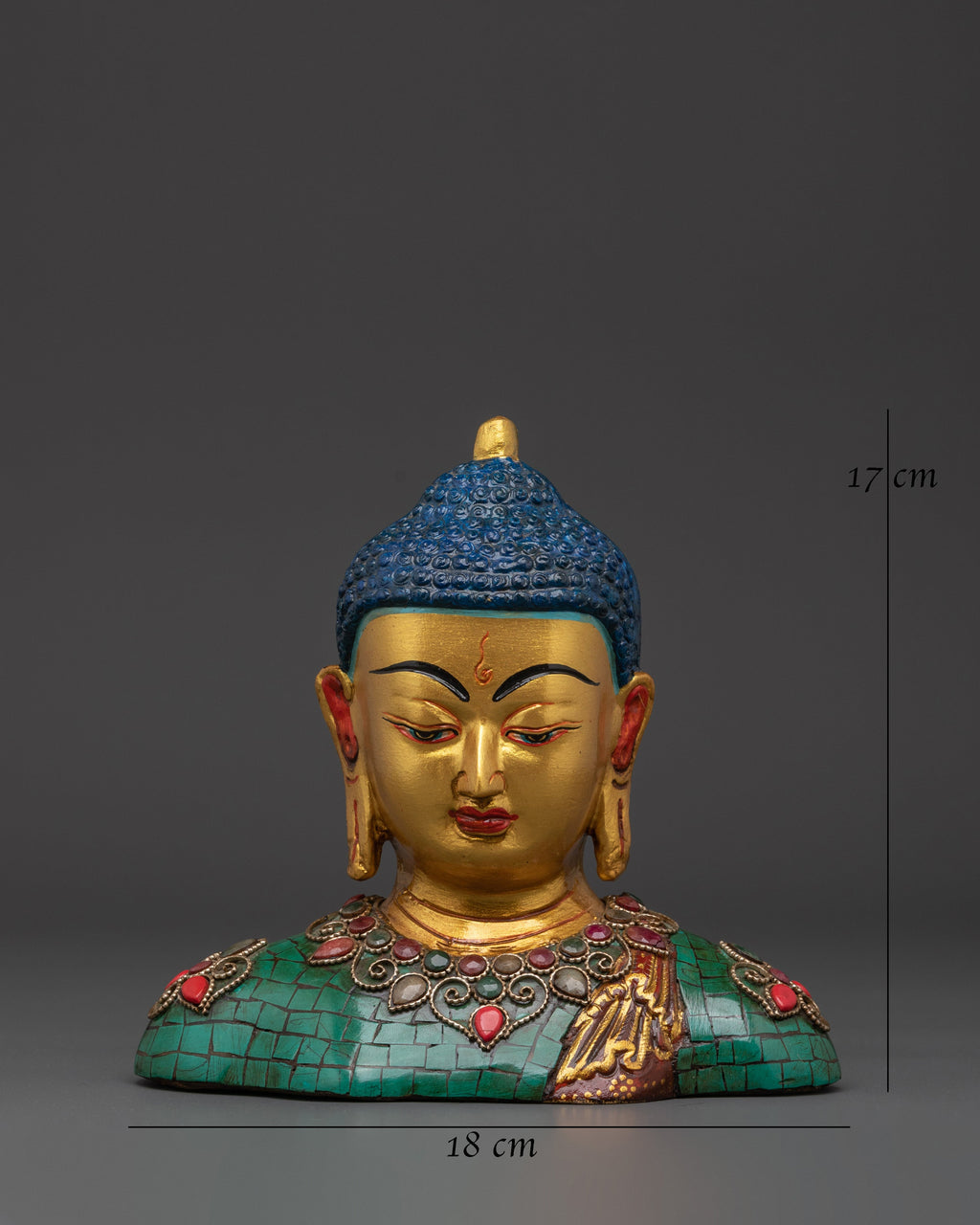 This handcrafted Buddha Head Sculpture depicts the tranquil essence of enlightenment and mindfulness, which is a sacred symbol of inner serenity in Tibetan Buddhist art. This intricately constructed statue is 17cm tall and 18cm wide, made of brass and embellished with brilliant coral and turquoise inlays. The placid facial expression, intricate crown, and traditional ornaments represent tranquillity and spiritual insight. This Buddha head is ideal for altars, meditation rooms, or sacred corners and promotes peace and positivity in any setting.