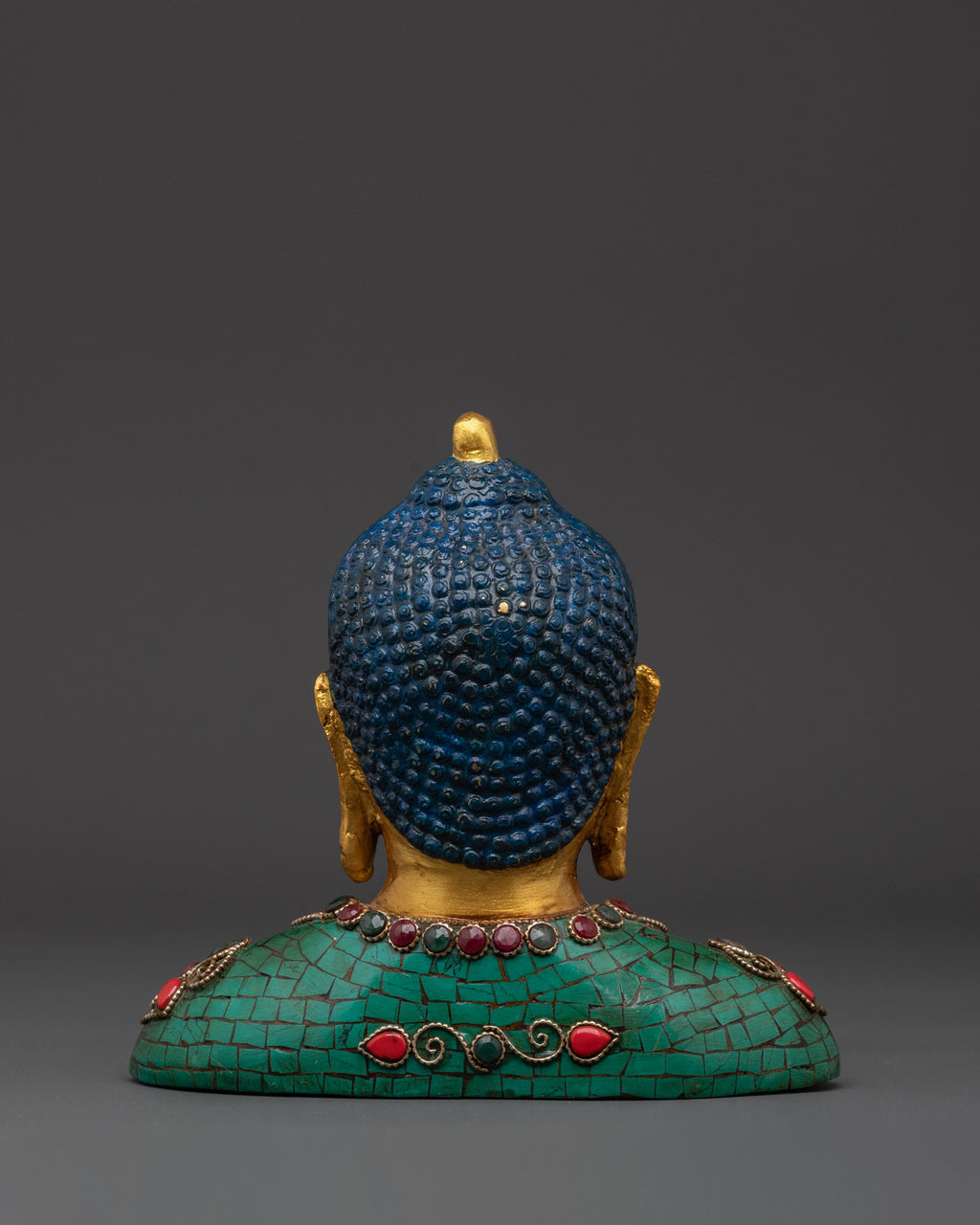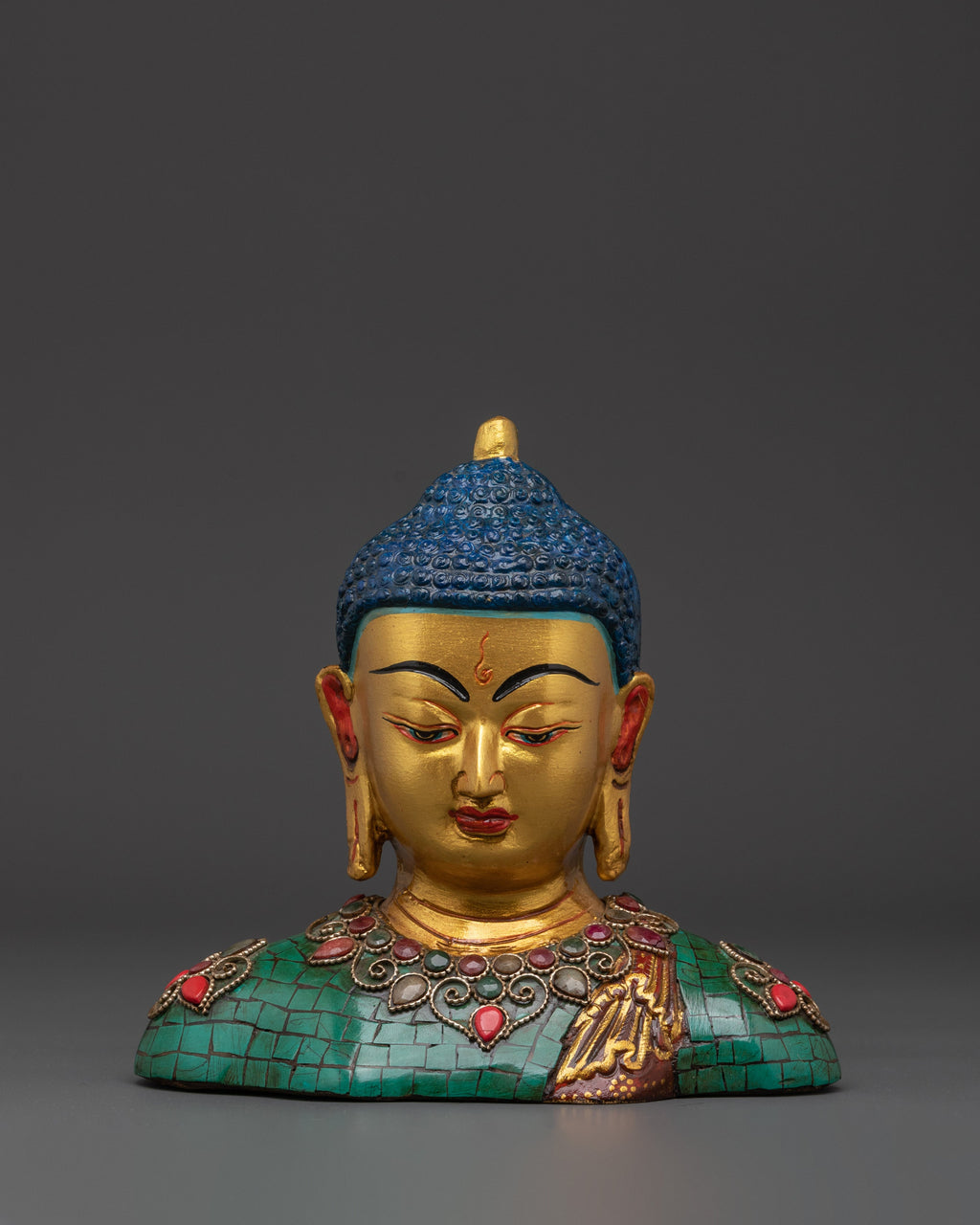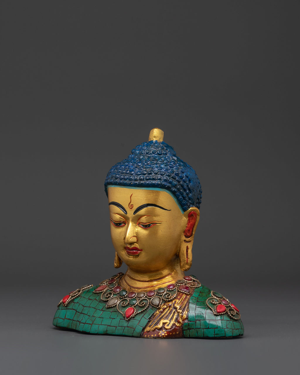 In Buddhist tradition, the Buddha's head symbolizes the enlightened mind and the path to enlightenment. This handcrafted Buddha Head Sculpture exudes tranquility, making it suitable for people seeking mindfulness and inner harmony. Whether placed on a shrine, desk, or display shelf, it promotes spiritual awareness and ornamental beauty. Its Tibetan brass craftsmanship, coral, and turquoise embellishments serve as a strong reminder of compassion, tranquility, and enlightenment.