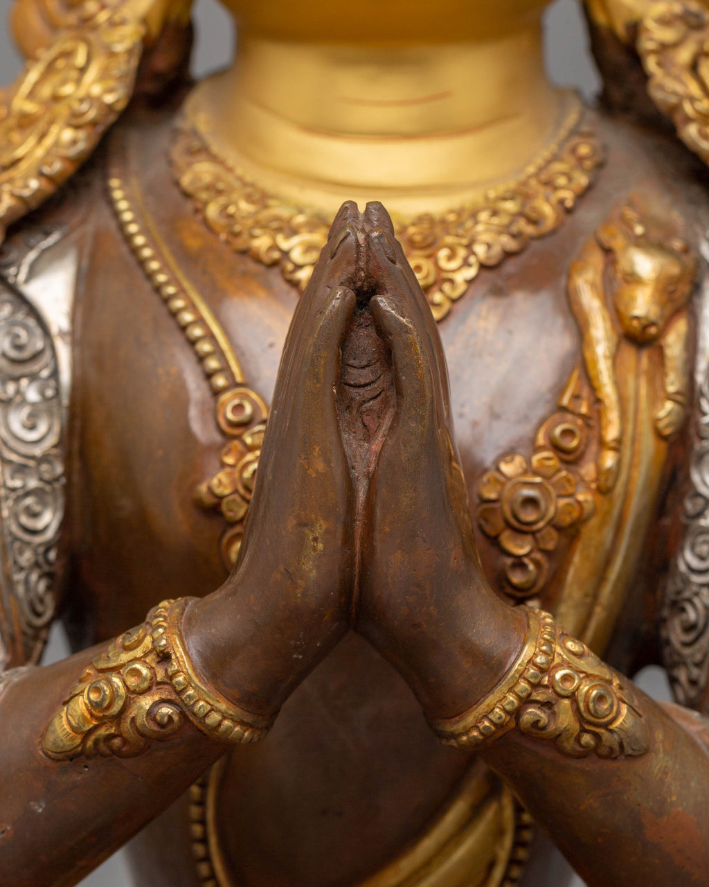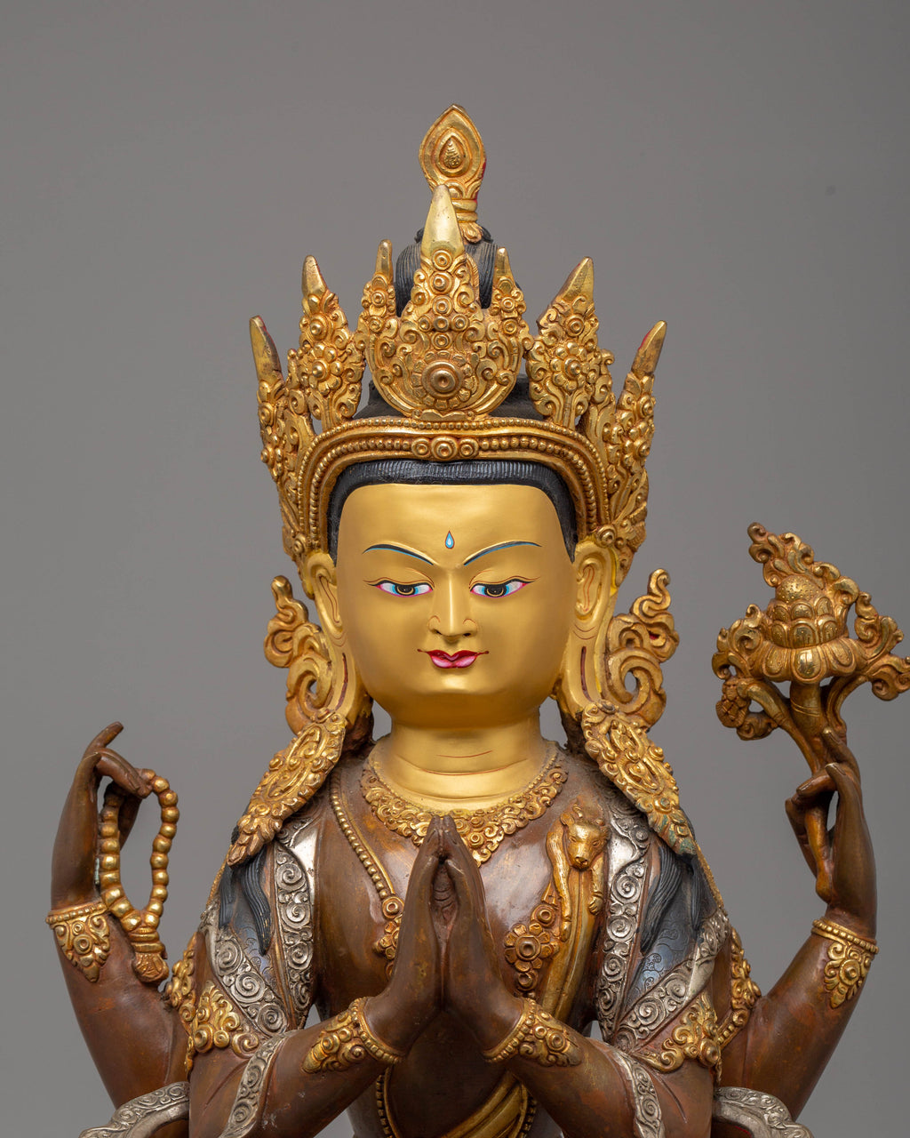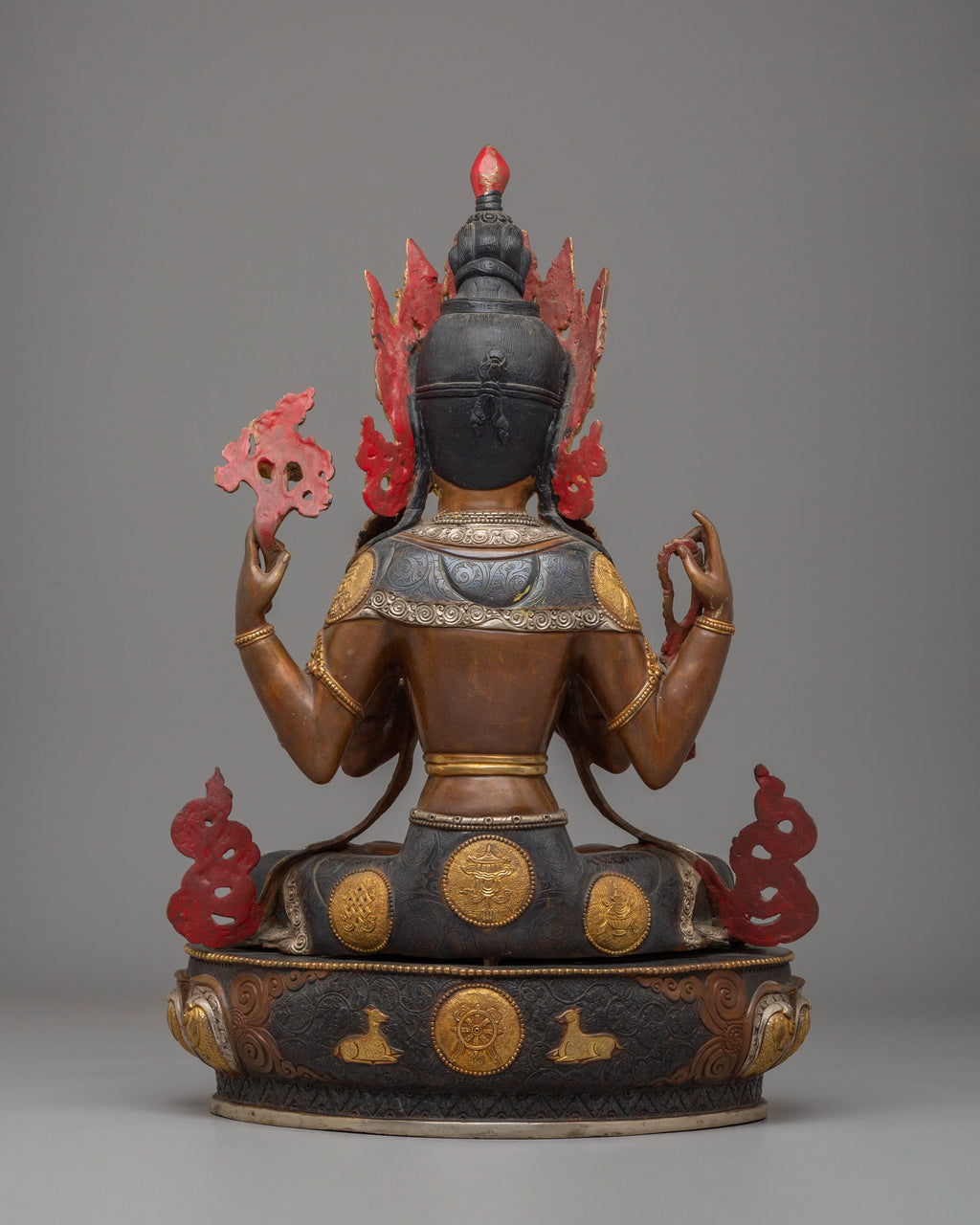 The Chenrezig Statue is rich in iconography, each element symbolizing key aspects of Buddhist teachings and the Bodhisattva’s compassionate nature. Chenrezig is depicted with four arms, each representing the Bodhisattva’s boundless ability to extend compassion in various forms. In the right hand, Chenrezig holds a rosary, symbolizing the continuous practice of prayer and meditation, while the left hand holds a lotus, signifying purity and spiritual awakening. The two hands joined together in Anjali mudra—a gesture of prayer and reverence—reflect the Bodhisattva’s humility and devotion. The statue is set upon a lotus base, symbolizing the emergence of wisdom from the murky waters of ignorance, and crowned with a precious crown, signifying Chenrezig’s noble status as the embodiment of compassion and the supreme protector of sentient beings. Together, these symbols reflect Chenrezig's deep commitment to helping all beings attain enlightenment.