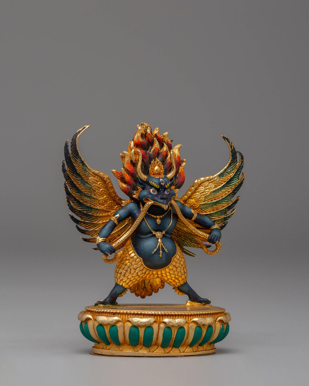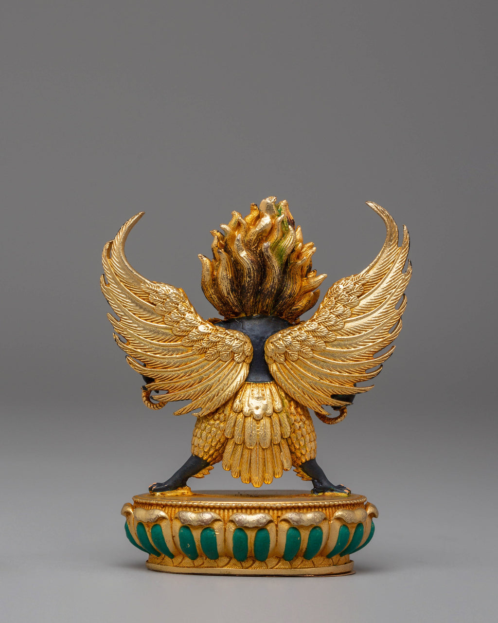 In this depiction, the Garuda, a divine protector in Buddhist tradition, spreads his wings in triumph. His vivid eyes and flaming crest symbolize vigilance and wisdom, while his stance on a lotus signifies victory over ignorance. The intricate detailing reflects devotion and mastery. This Buddhist Garuda sculpture is more than decor; it is a guardian of light embodying courage, transcendence, and eternal strength.