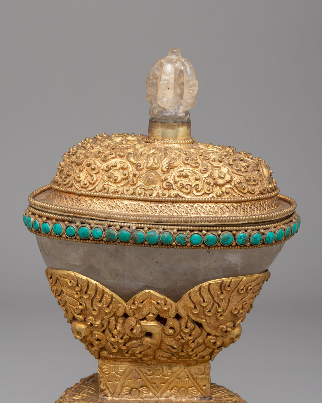 The Kapala features delicate gemstones, such as turquoise, carefully set throughout the structure to enhance its spiritual power and aesthetic appeal. The upper part of the Kapala is adorned with a crystal lid, symbolizing the clarity of wisdom and the purity of enlightenment. Its gold plating represents the sacred energy of the Buddha’s teachings, infusing the object with divine energy. The copper body offers strength and grounding, while the intricate design patterns provide a spiritual representation of Tibetan motifs used in meditative and ritualistic practices.