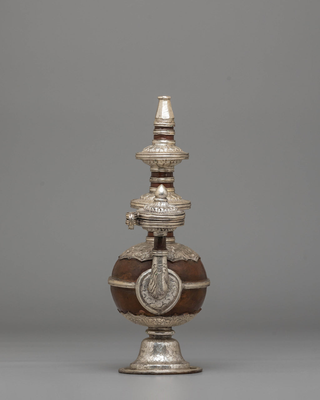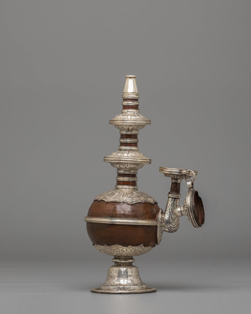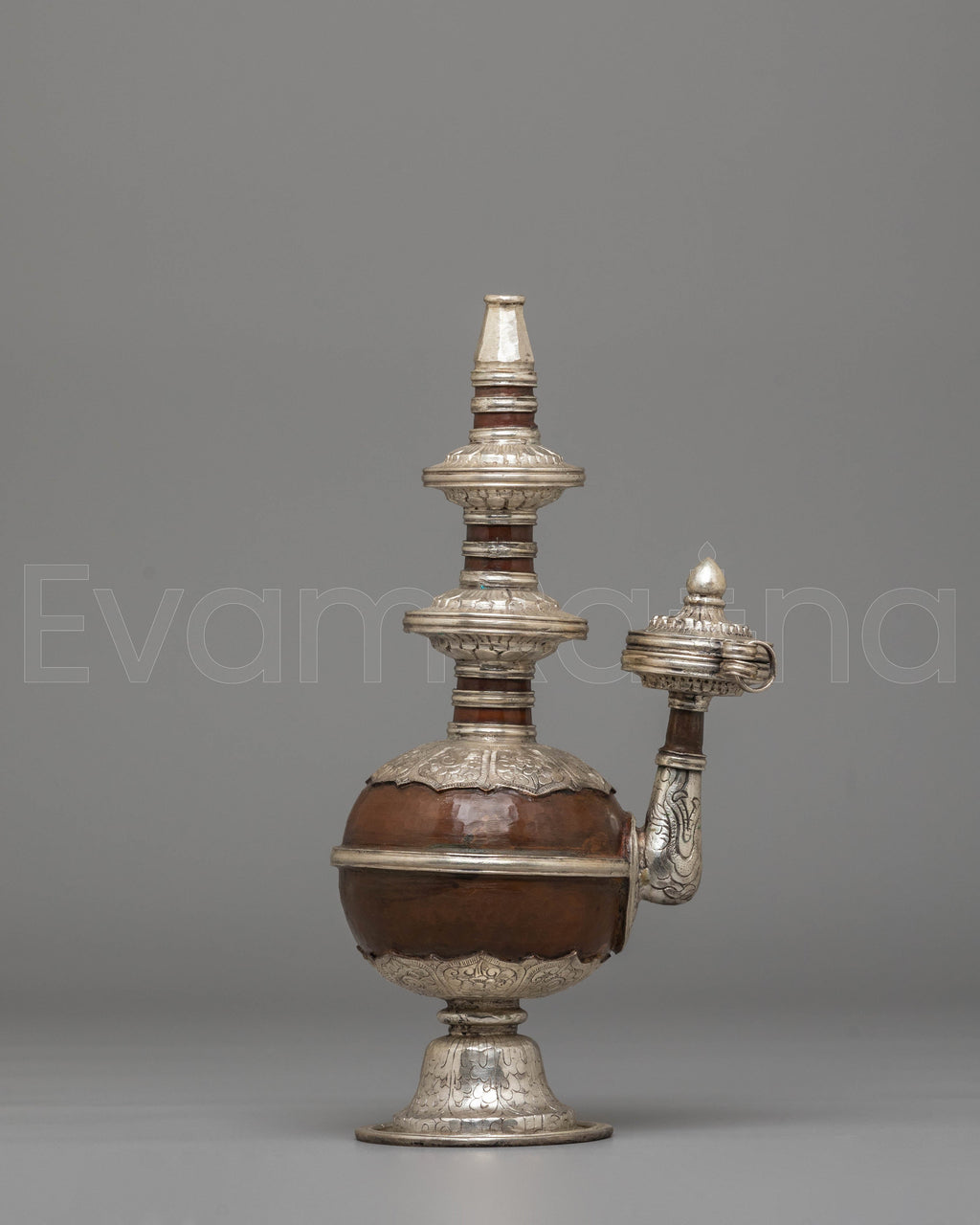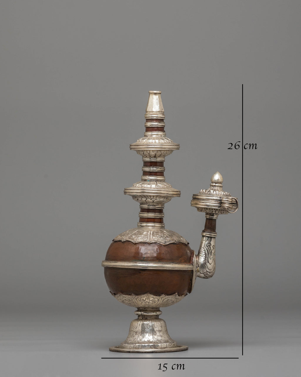 Traditionally, such ceremonial tea pots are used in Tibetan Buddhist ceremonies to offer tea to deities and guests. The intricate designs and symbolic motifs on the teapot hold deep spiritual meaning, representing prosperity, protection, and harmony. With its elegant shape and delicate craftsmanship, this teapot not only enhances the aesthetic of any space but also carries profound spiritual significance, making it a meaningful addition to any collection or altar.