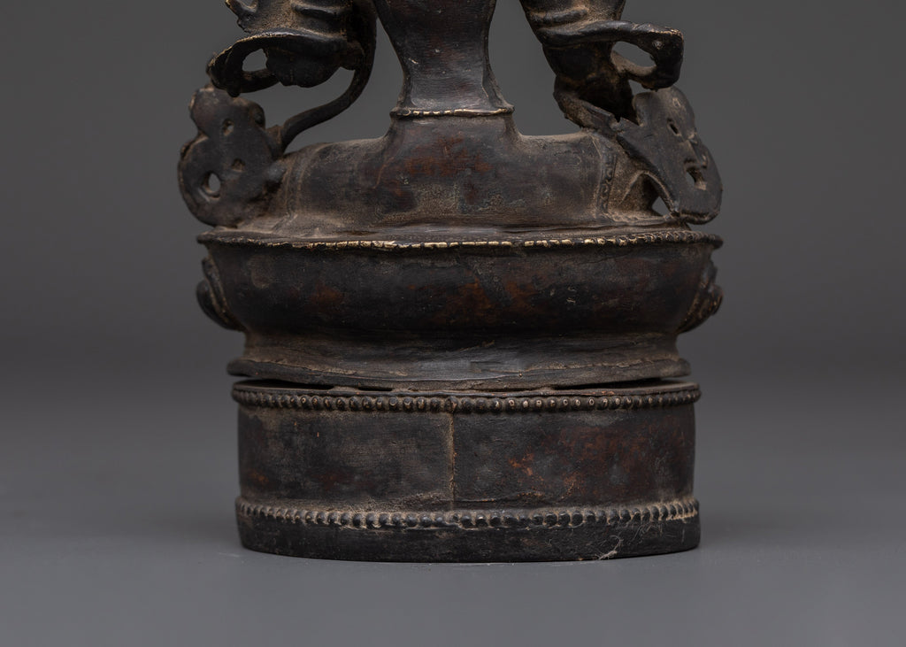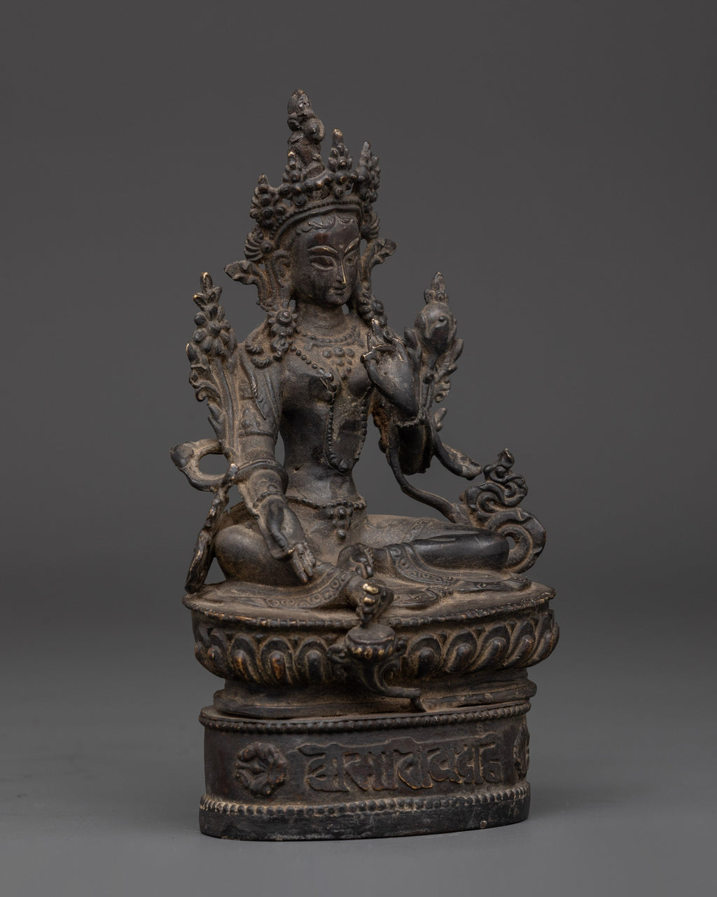 Green Tara is a bodhisattva who embodies swiftness and compassion and is honored in Tibetan Buddhism. She's portrayed as a gorgeous young figurine decked out in decorations. She's frequently sat in a relaxed position with one leg outstretched, poised to answer admirers' summons. The green hue of Tara's body represents life and her connection to charitable endeavors. As a mother figure, she provides beings on their spiritual path with support, protection, and direction. Devotees access Green Tara's compassion and support through prayers and visualizations, using her constant guidance to help them overcome challenges and achieve spiritual goals.