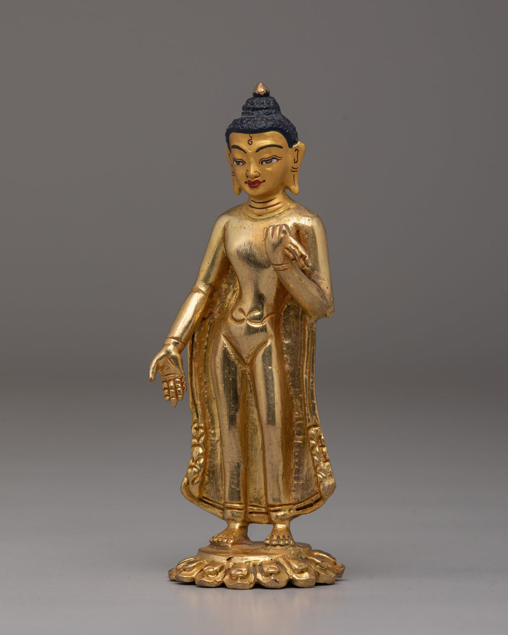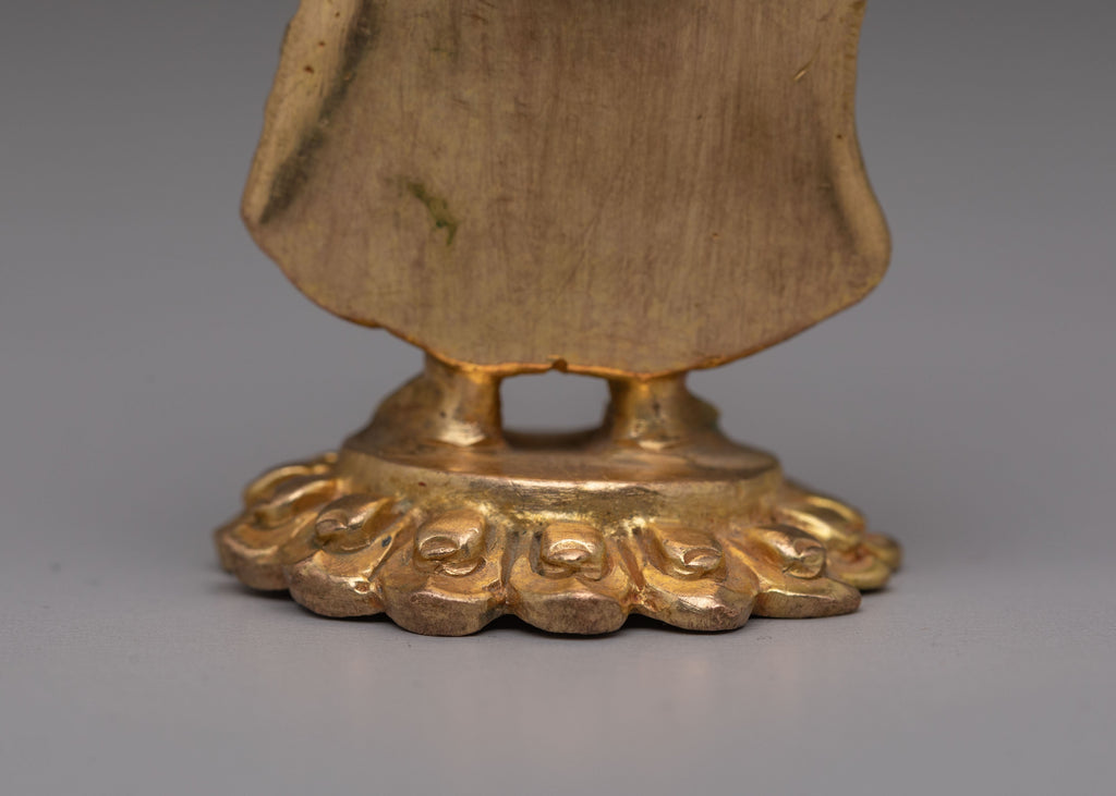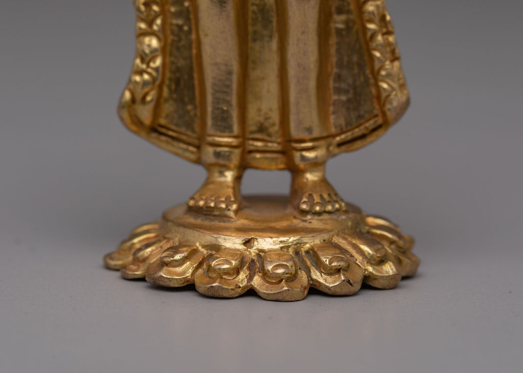 Dipankara Buddha, known as the "Buddha of the Past," is revered for his teachings of wisdom and enlightenment. The gold-plated finish gives this statue a radiant glow, symbolizing the illumination of the Buddha’s wisdom. His serene posture and peaceful expression remind all who view him of the path to spiritual awakening. This handcrafted statue, with its stunning blend of copper and gold accents, not only serves as a spiritual guide but also as an extraordinary piece of art. Whether placed on an altar or in a peaceful corner of your home, it invites divine energy, offering inspiration and tranquility to all who encounter it.