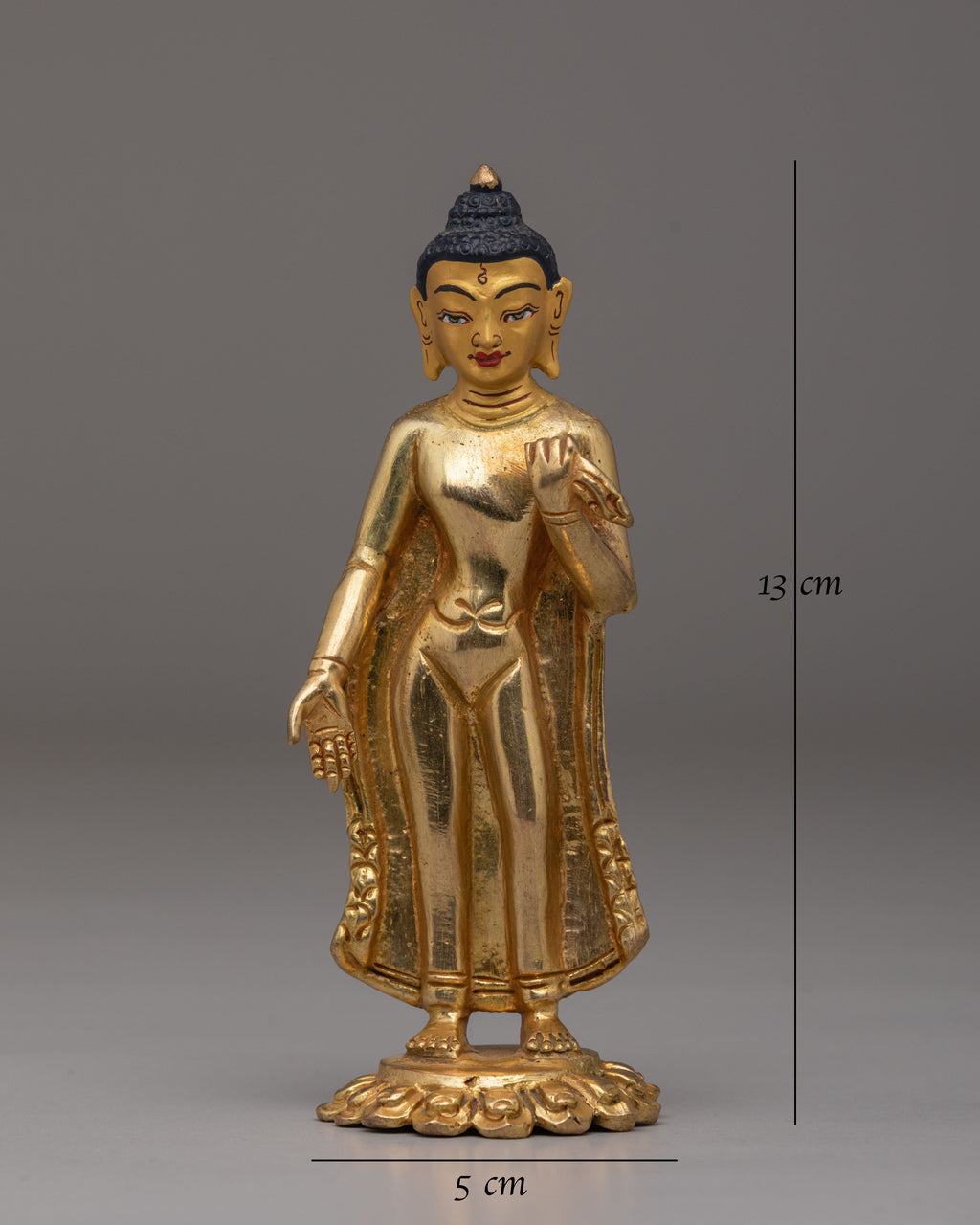 The Handcrafted Copper Dipankara Buddha Statue is a beautiful and powerful representation of Buddhist spiritual art, meticulously designed to embody wisdom, enlightenment, and compassion. Standing at 13cm in height and 5cm in width, this exquisite statue is crafted from high-quality copper, plated with 24K gold to enhance its divine presence. The statue's vibrant acrylic colors highlight the intricate details of the Dipankara Buddha's serene expression, creating a profound connection to the divine. Weighing 0.24 kg, it is the perfect size to adorn any meditation space or altar, bringing peace and light into your sacred environment.