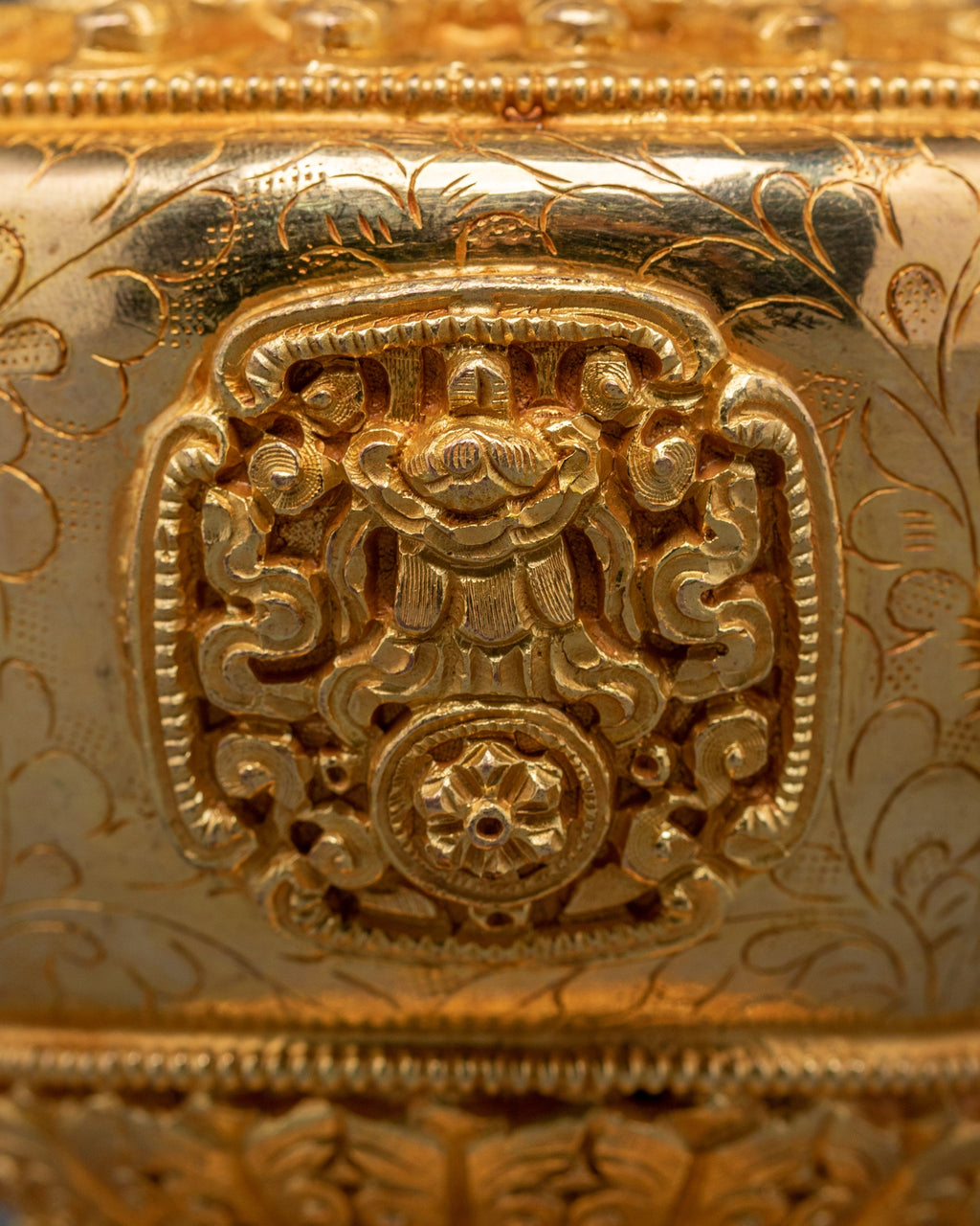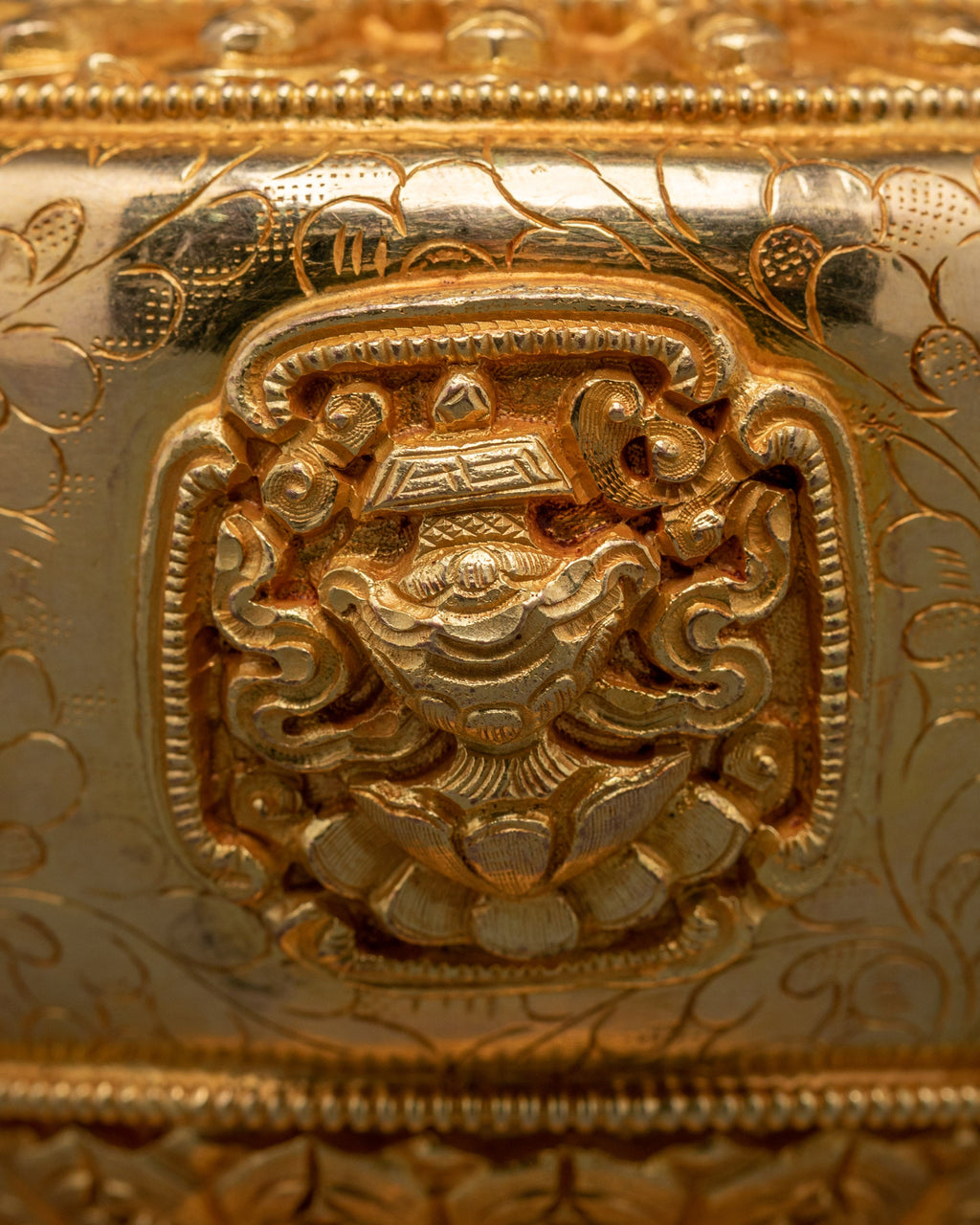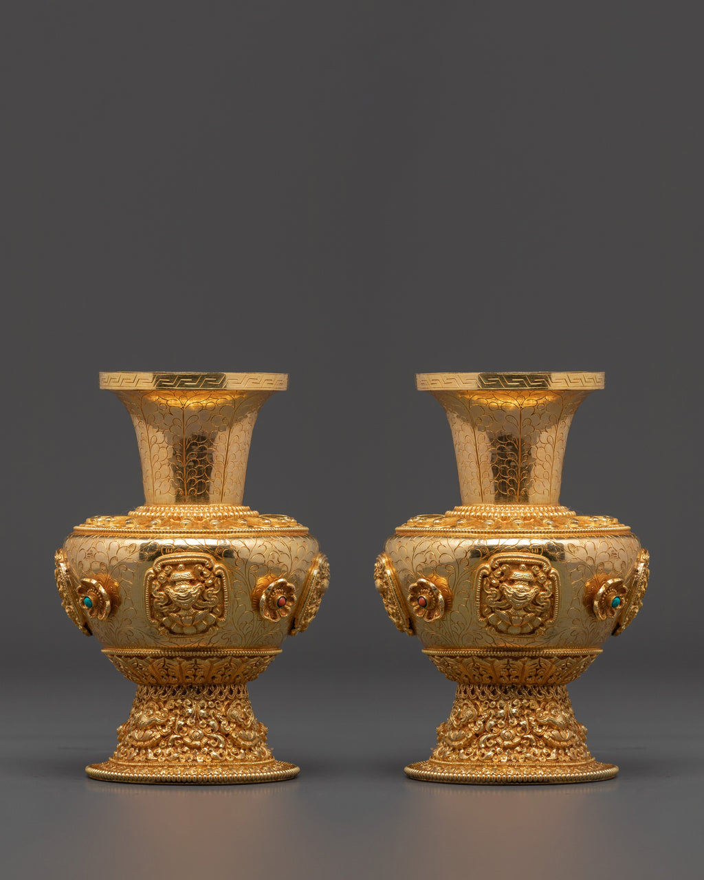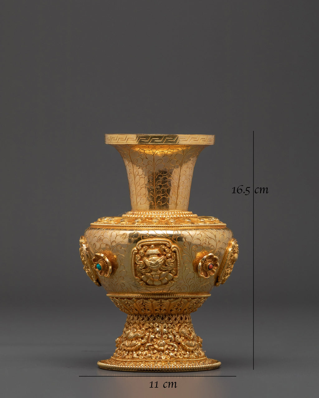 This Handcrafted Copper Vase with Beautiful Carvings is a sacred ritual item widely used in Tibetan Buddhist practice. Crafted with a copper body and finished with radiant gold plating, the vase symbolizes purity, generosity, and devotion. Its elegant form, combined with intricate carvings, makes it not only a meaningful spiritual object but also a stunning piece of Himalayan art for altars and shrine spaces.
