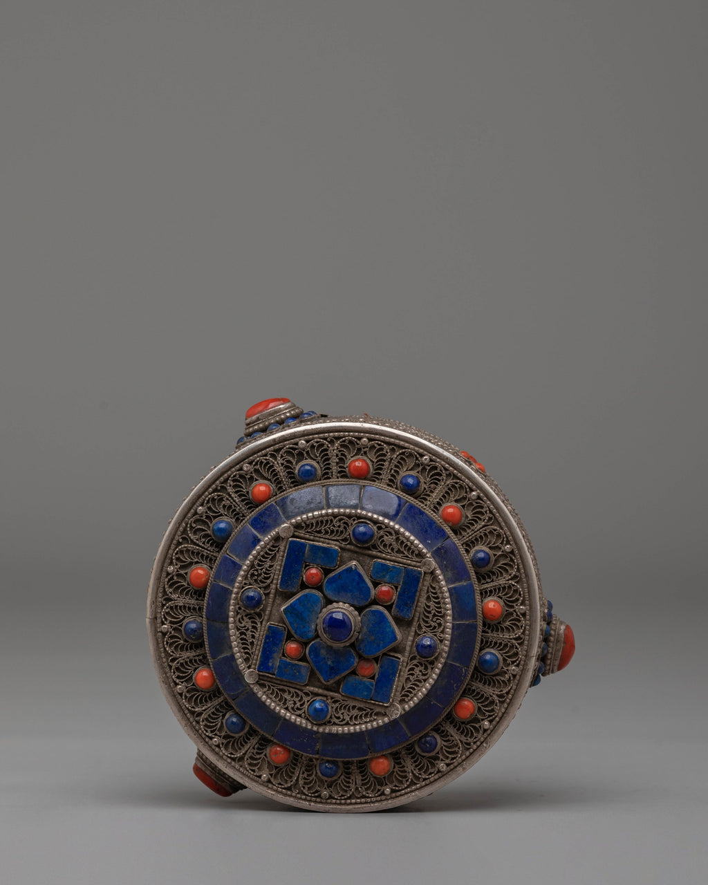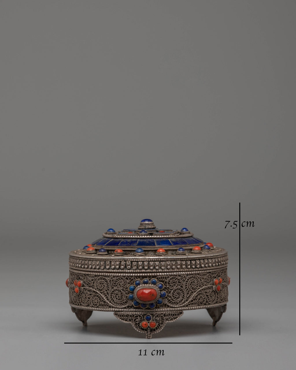 The Handcrafted Decorative Jewelry Box is a stunning piece of art, combining both beauty and functionality. Standing at 7.5cm in height and 11cm in width, with a weight of 0.24kg, this box is expertly crafted from silver and adorned with semi-precious coral. The combination of these materials not only creates an elegant and timeless appearance but also imbues the box with the protective and energetic properties of coral, which is known for promoting vitality and safeguarding its owner. This box is perfect for storing your most cherished jewelry, rings, and trinkets while adding a touch of spiritual elegance to your space.