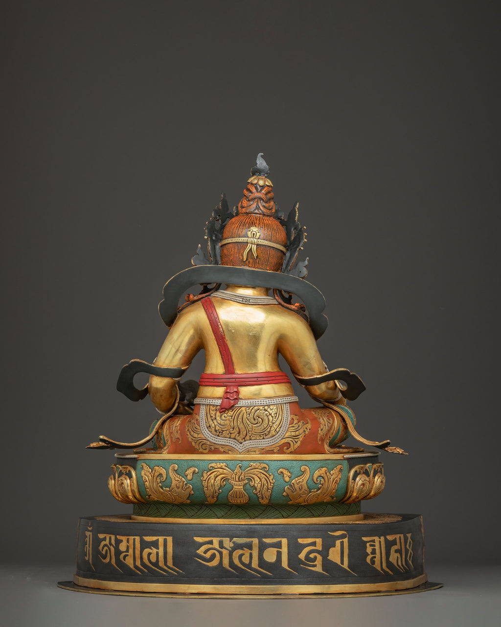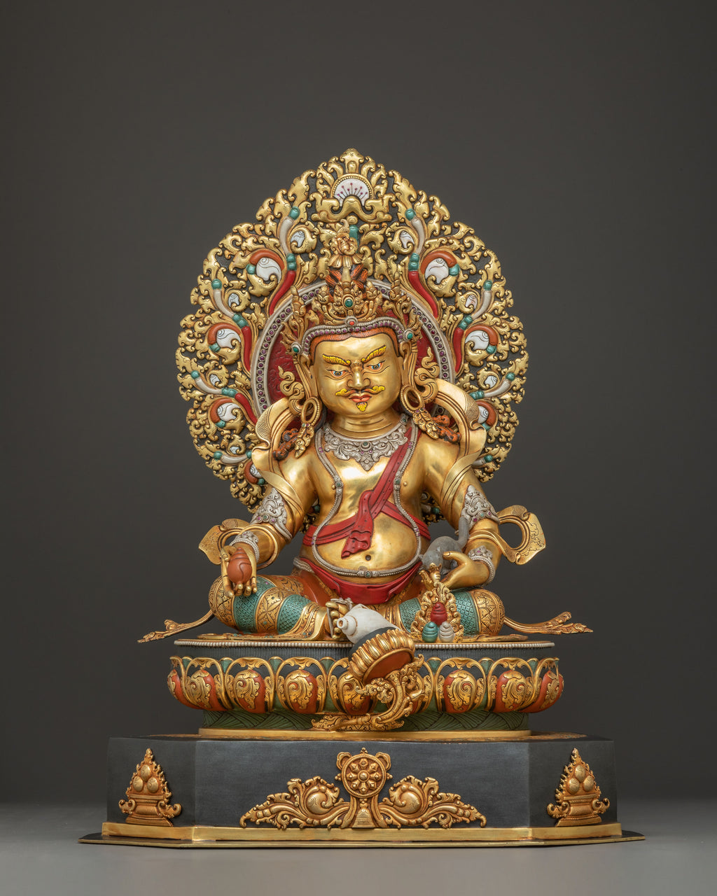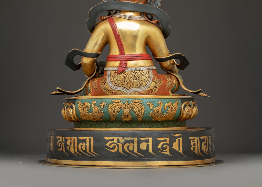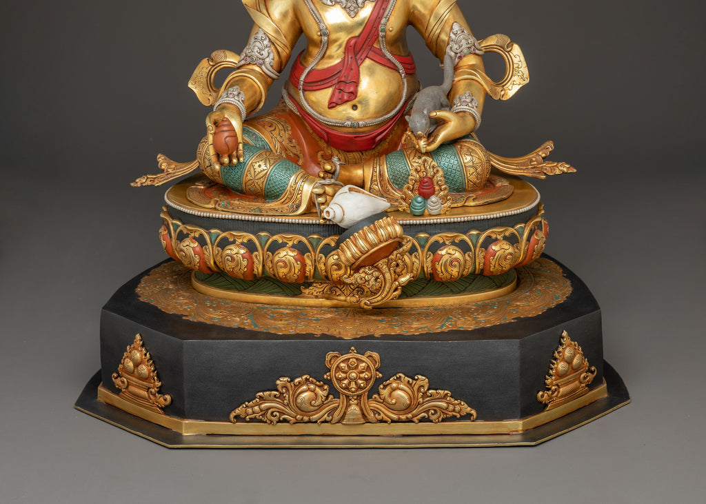 In this statue, Dzambhala is portrayed seated gracefully on a lotus base, symbolizing purity and spiritual elevation. His right leg is extended, signifying his readiness to act benevolently and bestow wealth upon others. He holds a mongoose in his right hand, which spits jewels, representing boundless riches and generosity. His left hand holds a citron fruit, a symbol of fulfillment and prosperity. Adorned with a five-pointed crown representing the Five Dhyani Buddhas, he exudes regal authority. His form is richly decorated with intricate ornaments, underscoring his divine status as the deity of abundance and protection.