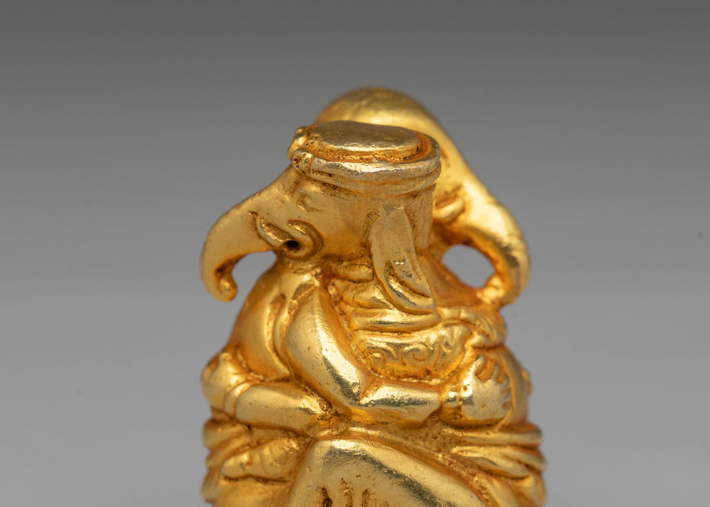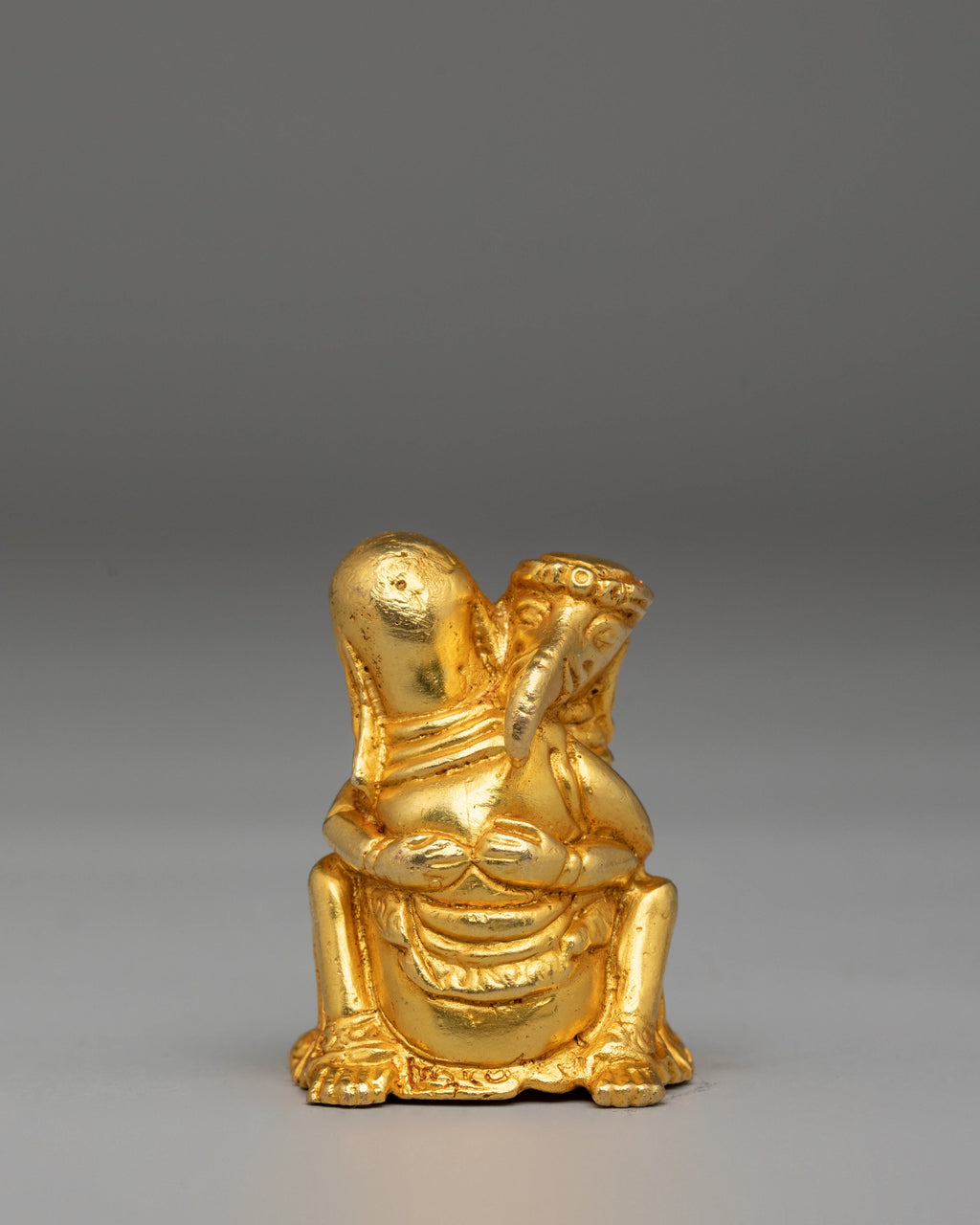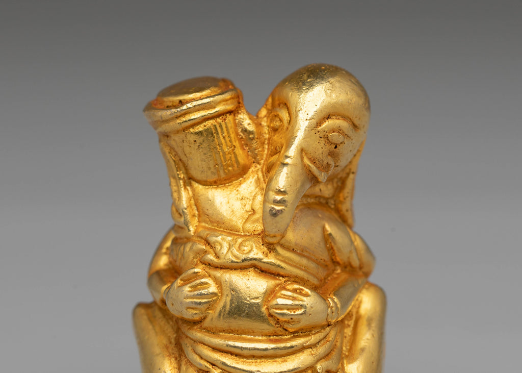Elephants are revered in many cultures as symbols of strength, loyalty, and intelligence. In Hinduism and Buddhism, the elephant is also associated with the deity Ganesha, the remover of obstacles and the god of wisdom. This handcrafted sculpture features a unique pose of two figures symbolizing balance and harmony. The rich gold plating enhances its divine qualities, representing prosperity and good fortune. Whether displayed in your home or used in spiritual rituals, this artwork serves as a powerful reminder of the importance of wisdom, protection, and inner strength.