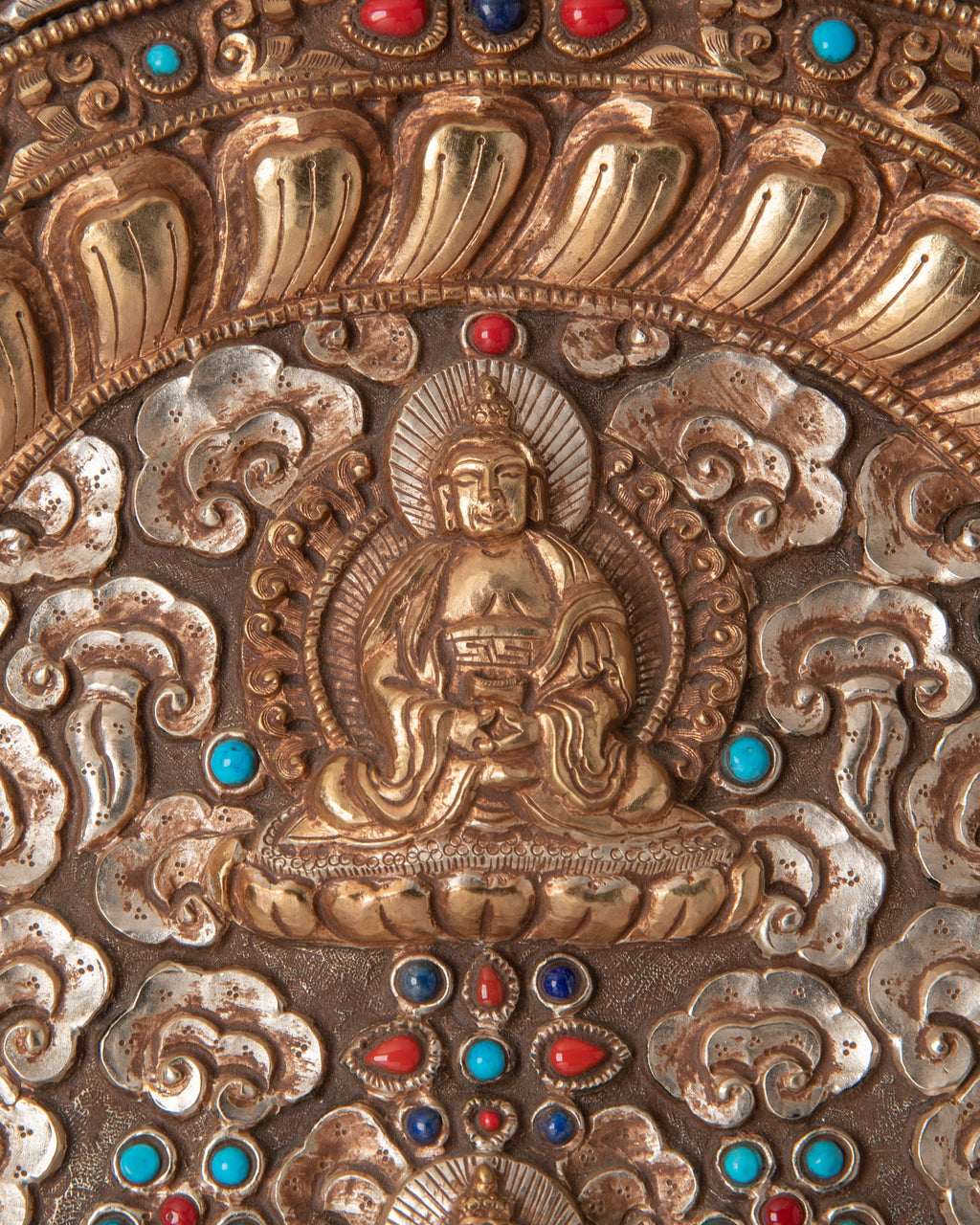 Crafted from high-quality copper, this wall hanging is finished with gold and silver plating, offering a radiant, timeless look that enhances any altar or meditation space. The turquoise and coral stones (artificial) add color and depth to the piece, symbolizing the balance of the physical and spiritual worlds. The detailed craftsmanship and vibrant colors make this a stunning statement piece for any home or sacred space, perfect for Buddhist practitioners, collectors, or anyone seeking spiritual balance and enlightenment.