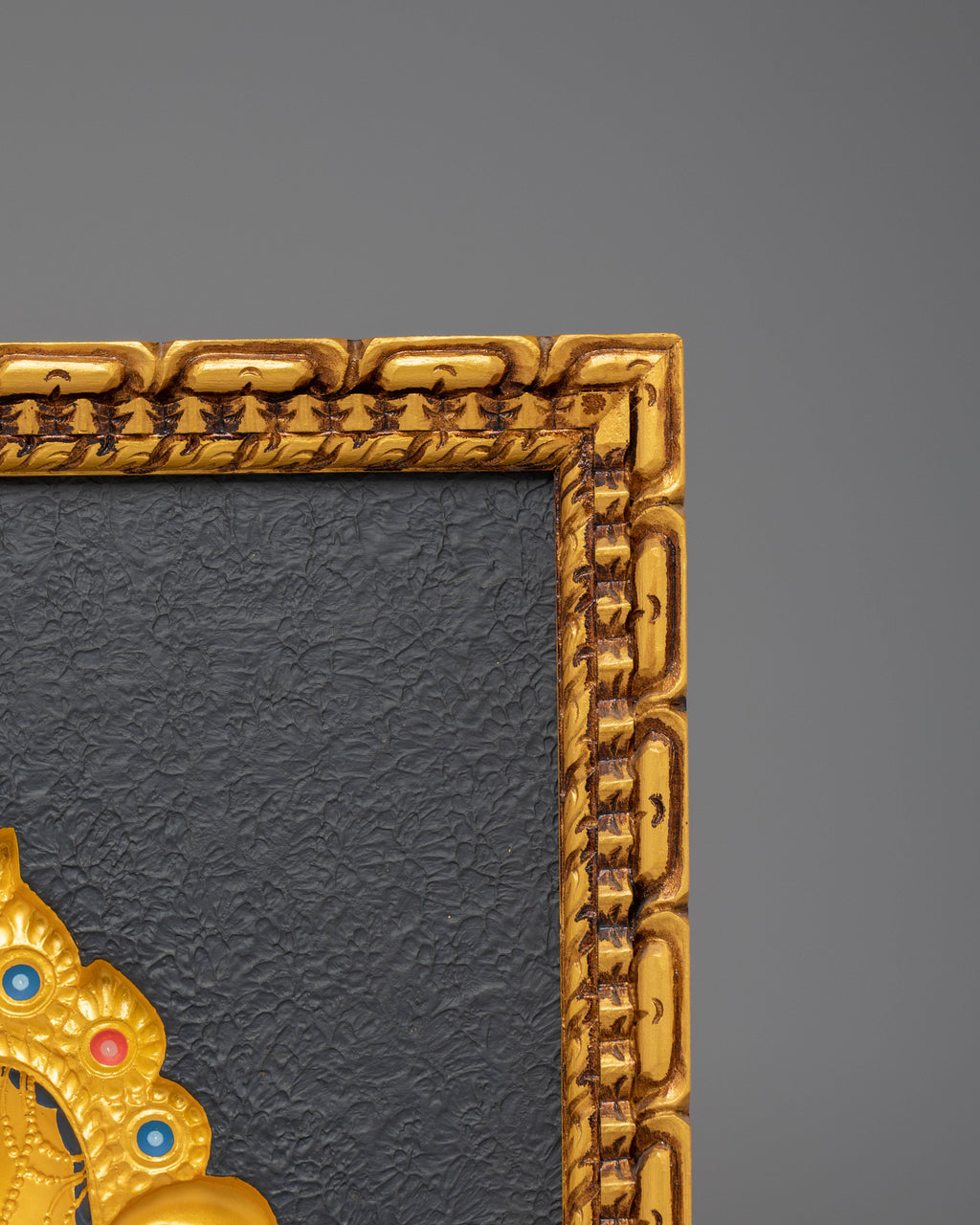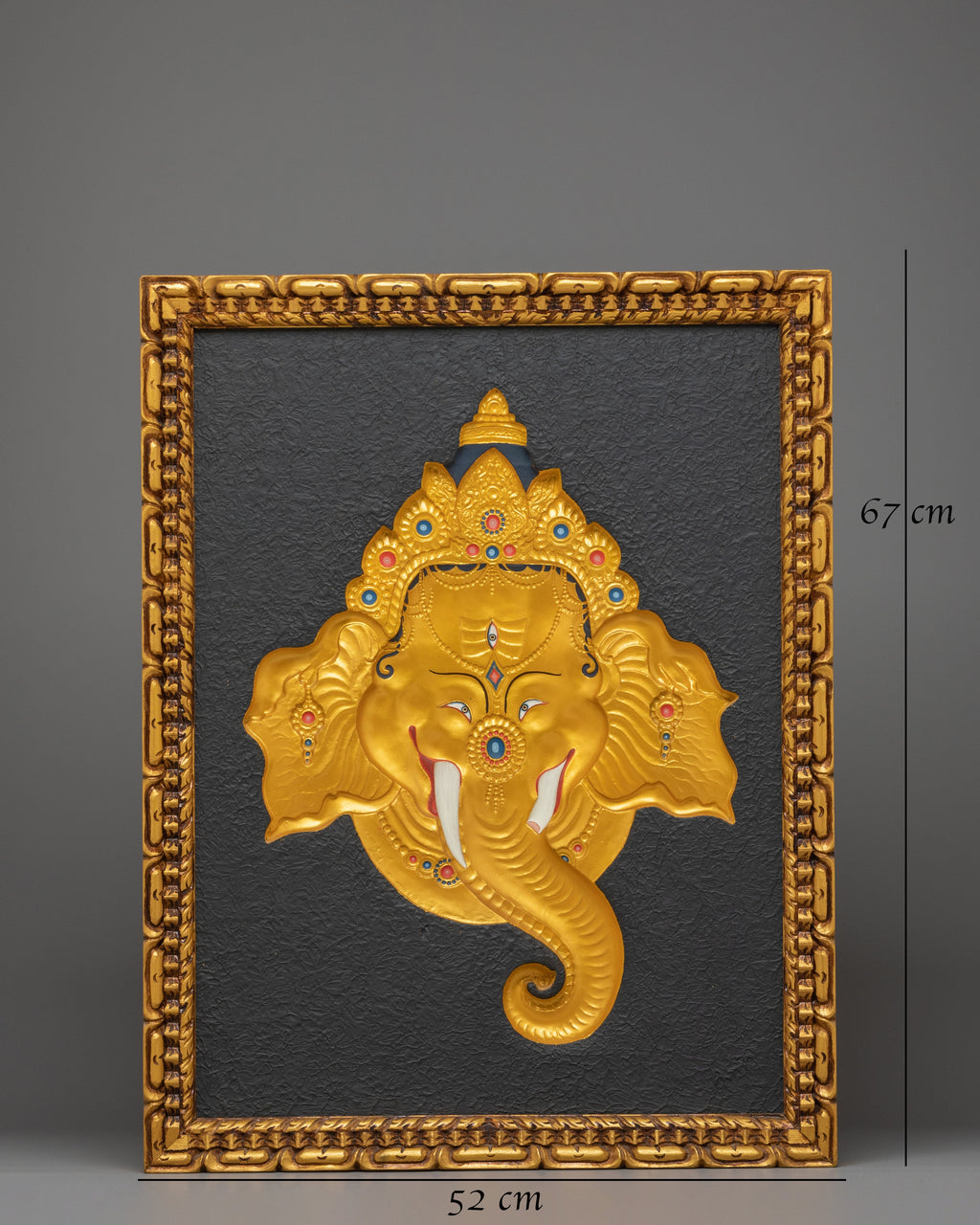 This wooden Ganesha wall hanging showcases the beauty of traditional craftsmanship through its fine relief technique. Each feature, from Ganesha’s crown to his peaceful expression, is carefully sculpted and hand-painted with rich acrylic hues. The ornate golden frame enhances its regal look, while the textured background adds depth and contrast, allowing the deity’s radiant form to stand out. The design reflects artistic devotion, cultural richness, and spiritual symbolism — making it both a sacred centerpiece and a work of art.