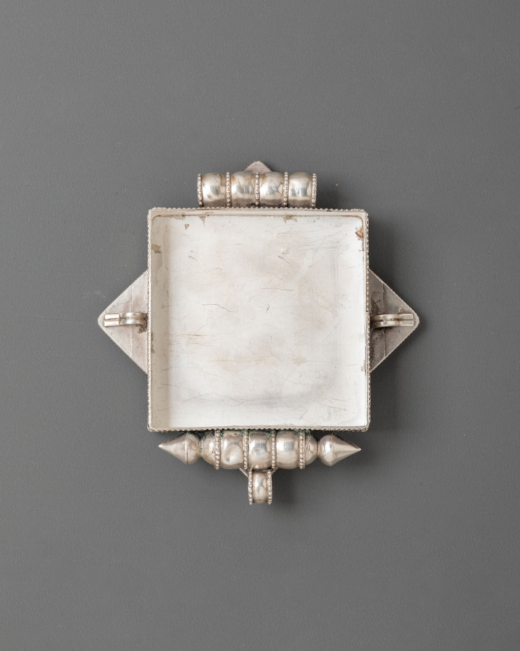 The Handcrafted Ghau Box Locket with Vase Motif is a captivating piece of Tibetan jewelry that beautifully combines traditional craftsmanship with spiritual symbolism. Measuring 11.5 cm in height and 10.5 cm in width, this locket features a vase motif, which symbolizes abundance, nourishment, and spiritual growth in Tibetan culture. The base of the locket is made of silver, with intricate detailing that highlights the beauty of the semi-precious stones—coral and turquoise. The vibrant colors and skillful placement of these stones add a unique touch, making it both an aesthetically pleasing and meaningful piece.