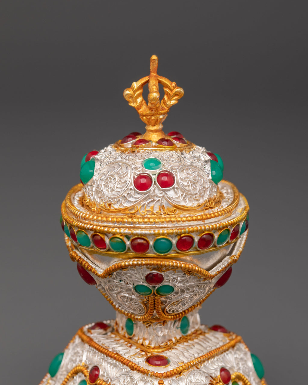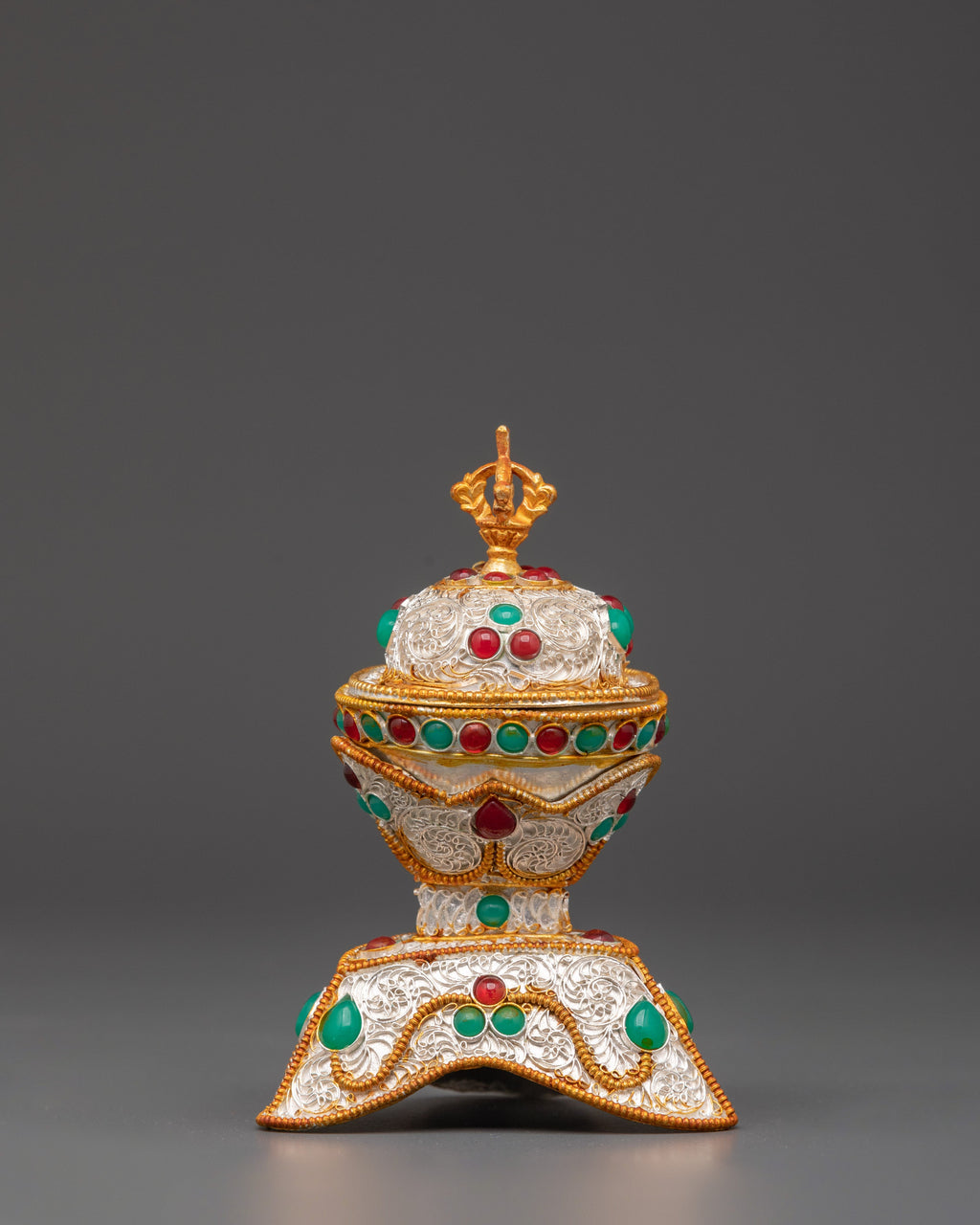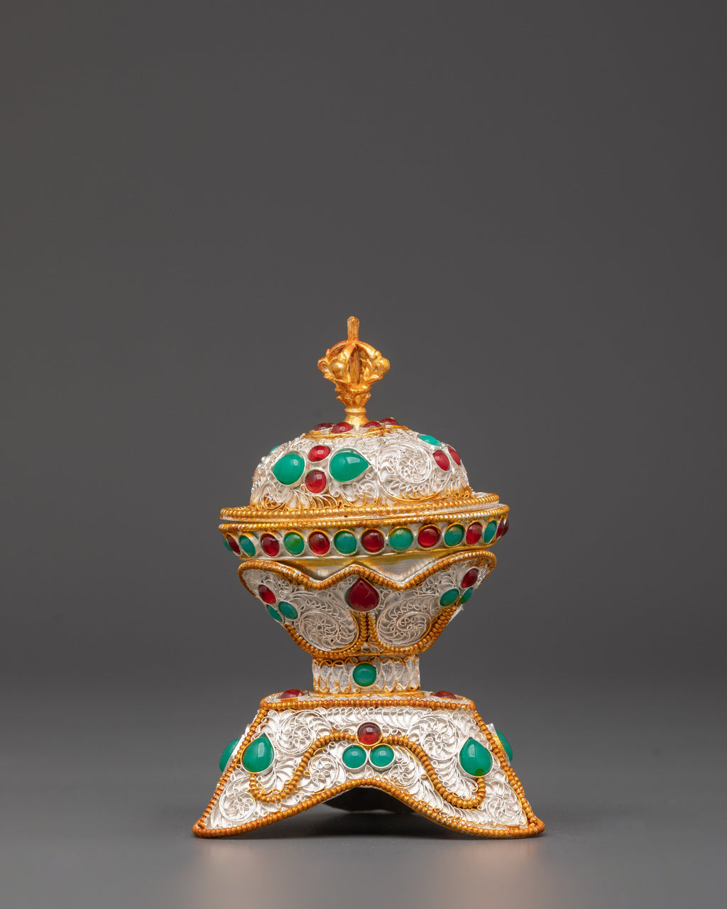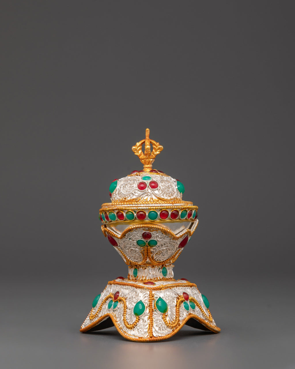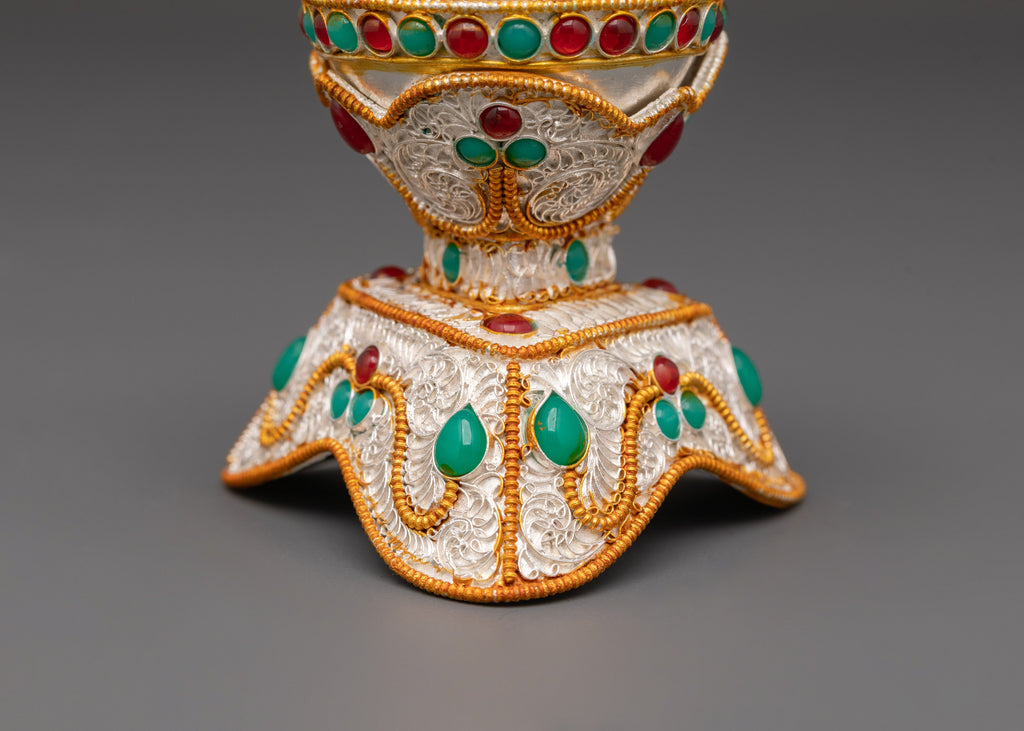 The Kapala is a significant tool in many Buddhist and Hindu rituals, often used to symbolize the offering of the practitioner’s body, speech, and mind in devotion. The coral and turquoise stones are rich in symbolism—coral representing vitality and strength, while turquoise symbolizes wisdom and healing. The gold-plated finish highlights the divine nature of the offering, signifying the journey toward enlightenment and spiritual growth. The royal crown motifs and floral patterns further enhance the sacred nature of this set.