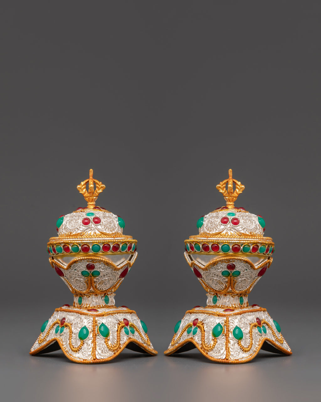 The Kapala set holds the nectar used in higher esoteric rituals. It offers liberation to gods and deities to ensure their devotion. The offerings are said to be transformed into the Wisdom Nectar, a liquid form of the deity's Enlightened Mind.