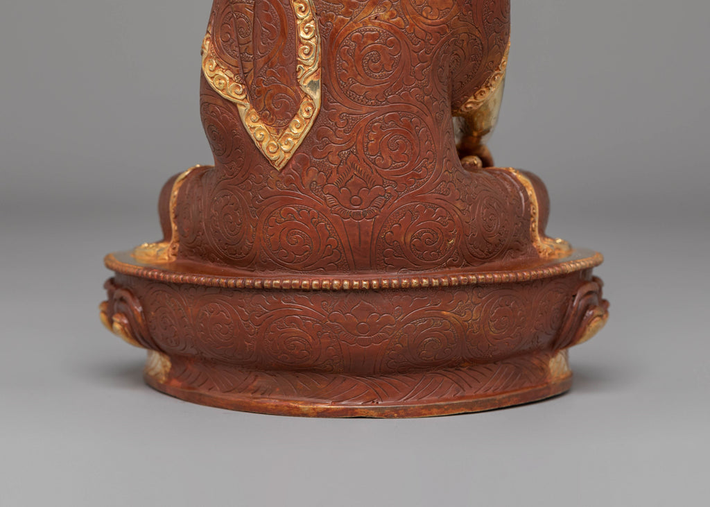 The Shakyamuni Buddha is depicted with his right hand in the Bhumisparsha Mudra, symbolizing the moment of enlightenment when he touched the Earth to witness his awakening. His left hand holds an alms bowl, representing his renunciation and devotion to the path of simplicity. The ushnisha, or crown-like topknot, signifies his wisdom and spiritual knowledge. Resting on a lotus base, the Buddha represents purity, rising above worldly attachments. Dressed in monastic robes, he embodies humility and the path of enlightenment.