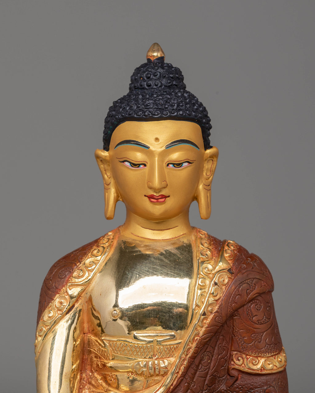 The Shakyamuni Buddha Statue is an exquisite spiritual sculpture that embodies tranquility and wisdom, meticulously crafted to convey the essence of the Buddha. Standing at 22cm in height and weighing 1.51 kg, this statue features a copper body finished with 24k gold plating and vibrant acrylic color accents. This carefully crafted statue serves as a powerful reminder of inner peace, mindfulness, and spiritual enlightenment.