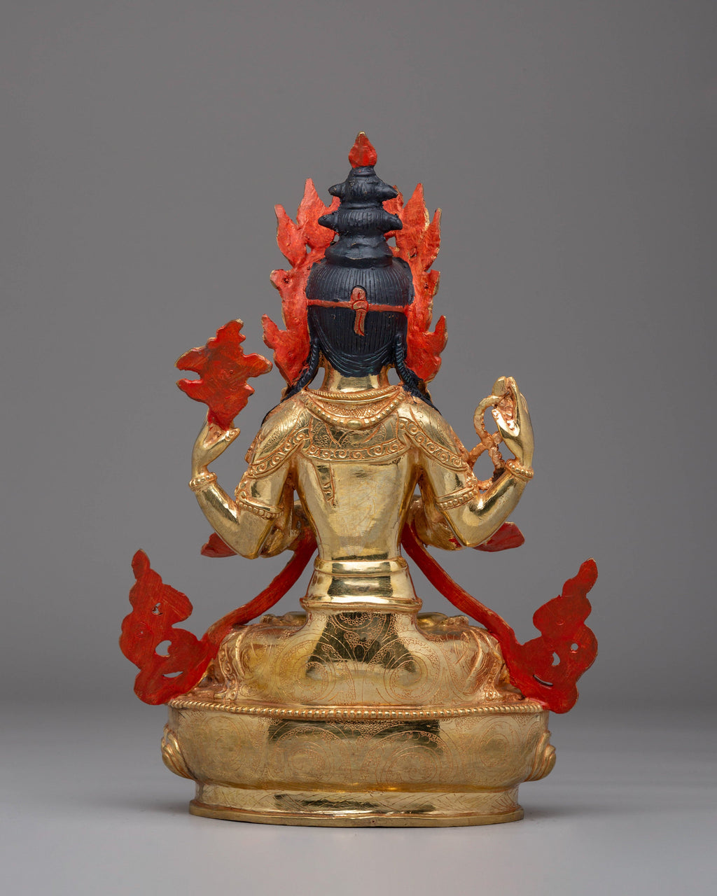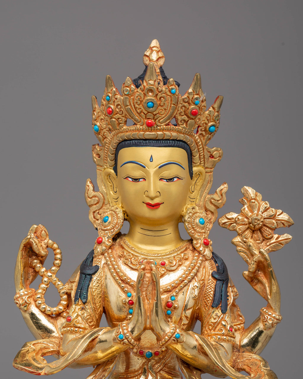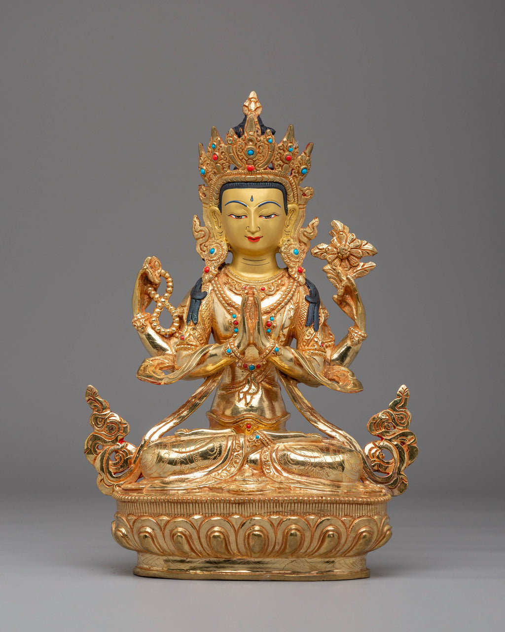 The design of each statue reflects the deep symbolism of the Buddha Dharma Sangha, with each figure meticulously crafted to convey their spiritual qualities. Guru Rinpoche (Padmasambhava) is depicted as a protector, holding a vajra and a lotus, embodying the transformative power of wisdom and compassion. Shakyamuni Buddha, the historical Buddha, sits in meditation, symbolizing peace and enlightenment. Chenrezig, the Bodhisattva of Compassion, is shown with multiple arms, extending compassion to all beings. Each statue’s 24K gold plating and vibrant acrylic accents highlight the intricate details of the lotus bases, crowns, and sacred objects, making the statues not just representations of the divine but also works of art.