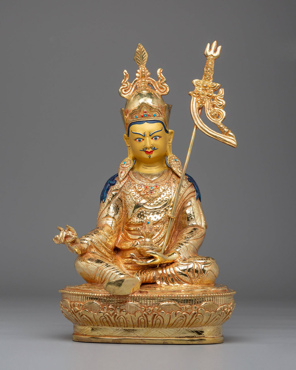 The Handcrafted Golden Statue of Buddha Dharma Sangha is a remarkable representation of the core teachings of Tibetan Buddhism. Standing 35cm tall, 21cm wide, and weighing 3.28kg, the statue portrays Guru Rinpoche in a serene, meditative pose, embodying the transformative power of wisdom and compassion. Crafted from copper with exquisite 24K gold plating, acrylic color, and gemstones, this statue radiates spiritual energy and sacred beauty. Ideal for altars, meditation spaces, or spiritual collections, it serves as a powerful symbol of protection, guidance, and enlightenment, inviting peace and positive energy into any environment.