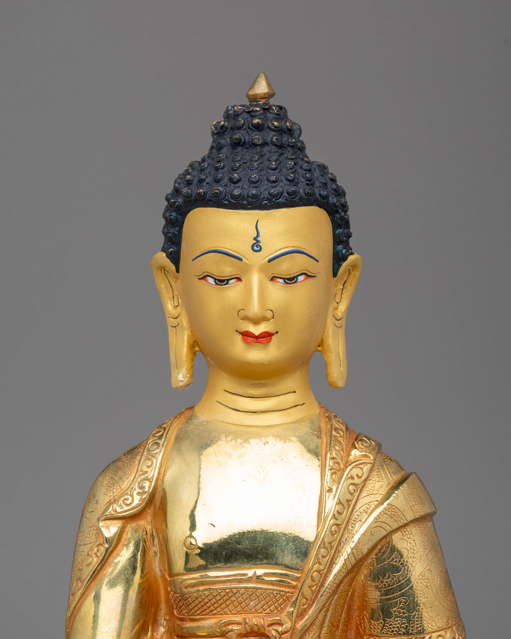 The Handcrafted Golden Statue of Buddha Dharma Sangha is a stunning collection of sacred figures, perfect for any spiritual altar or meditation space. This set includes three revered figures: Guru Rinpoche, Shakyamuni Buddha, and Chenrezig. The statues are made from copper and plated with 24K gold, creating a radiant and divine presence. The statues are also accented with acrylic colors and artificial stone, coral, and turquoise, adding vibrant details to their robes and faces. With the total weight of 8.85 kg and individual figures standing between 32 cm and 35 cm, these statues make an impressive addition to any sacred space.
