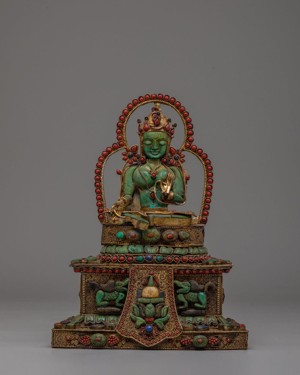 This Green Tara Statue for Decor is a beautiful and meaningful representation of the revered Tibetan goddess Green Tara, known for her infinite compassion and swift action in providing relief from suffering. Green Tara, one of the most popular deities in Tibetan Buddhism, is depicted as a savior, who is said to embody compassion and mercy, often invoked for protection and guidance. This exquisitely handcrafted statue is designed using premium materials, including copper, lapis lazuli, turquoise, and handcarved gemstones, all carefully chosen for their deep spiritual significance and aesthetic beauty.