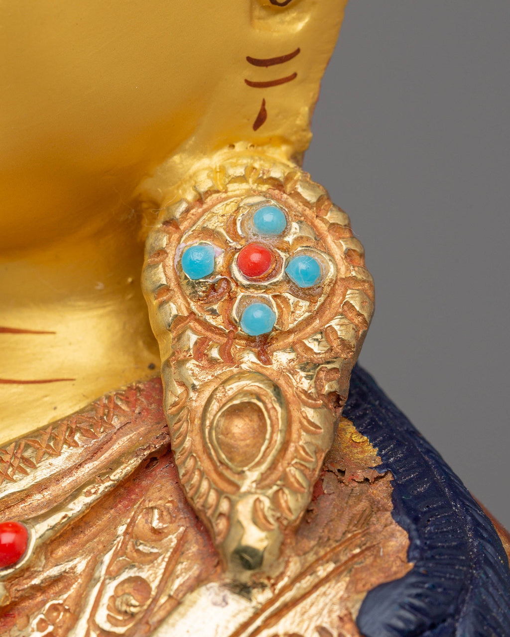 The Guru Rinpoche statue is rich in symbolic iconography, each element representing profound aspects of his enlightened qualities and spiritual power. He is depicted wearing a precious hat, symbolizing his high spiritual status and mastery of Vajrayana teachings. In his right hand, Guru Rinpoche holds a Vajra, a symbol of indestructible power and spiritual truth, representing his ability to transform ignorance into wisdom. In his left hand, he has a Kalasha, a sacred vessel filled with nectar, symbolizing abundance, life, and the flow of blessings to all beings. Resting by his side is the Khatvanga, a ritual staff that signifies his ability to guide sentient beings through the cycles of birth, death, and rebirth. The statue is set upon a lotus base, representing purity and enlightenment, symbolizing the unfolding of wisdom and compassion from the murky waters of samsara. Together, these elements highlight Guru Rinpoche's role as a supreme teacher and protector, capable of removing obstacles and leading beings to liberation.