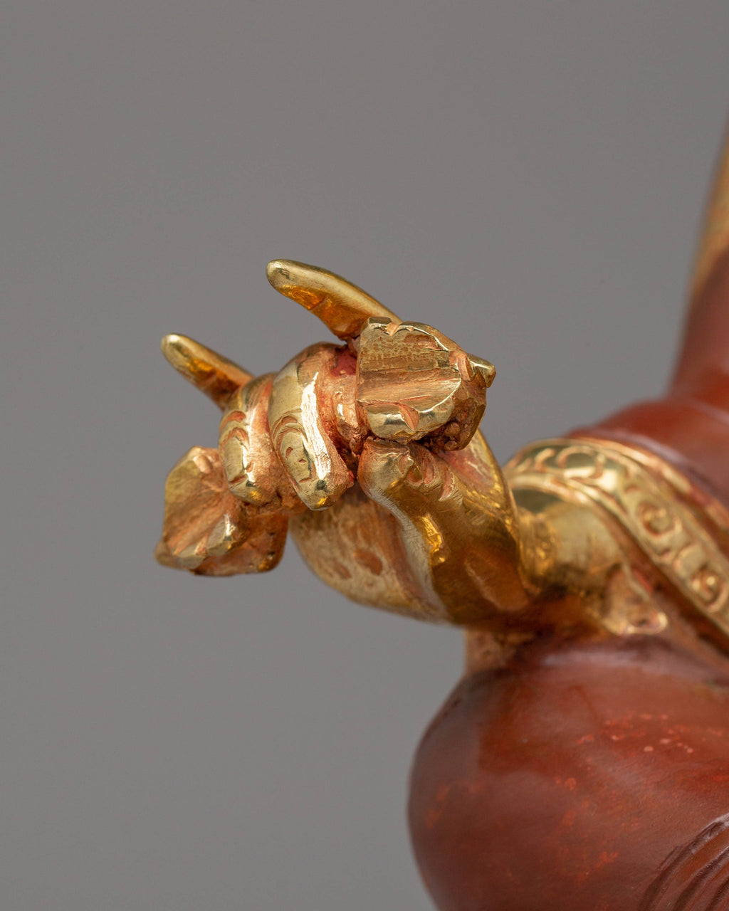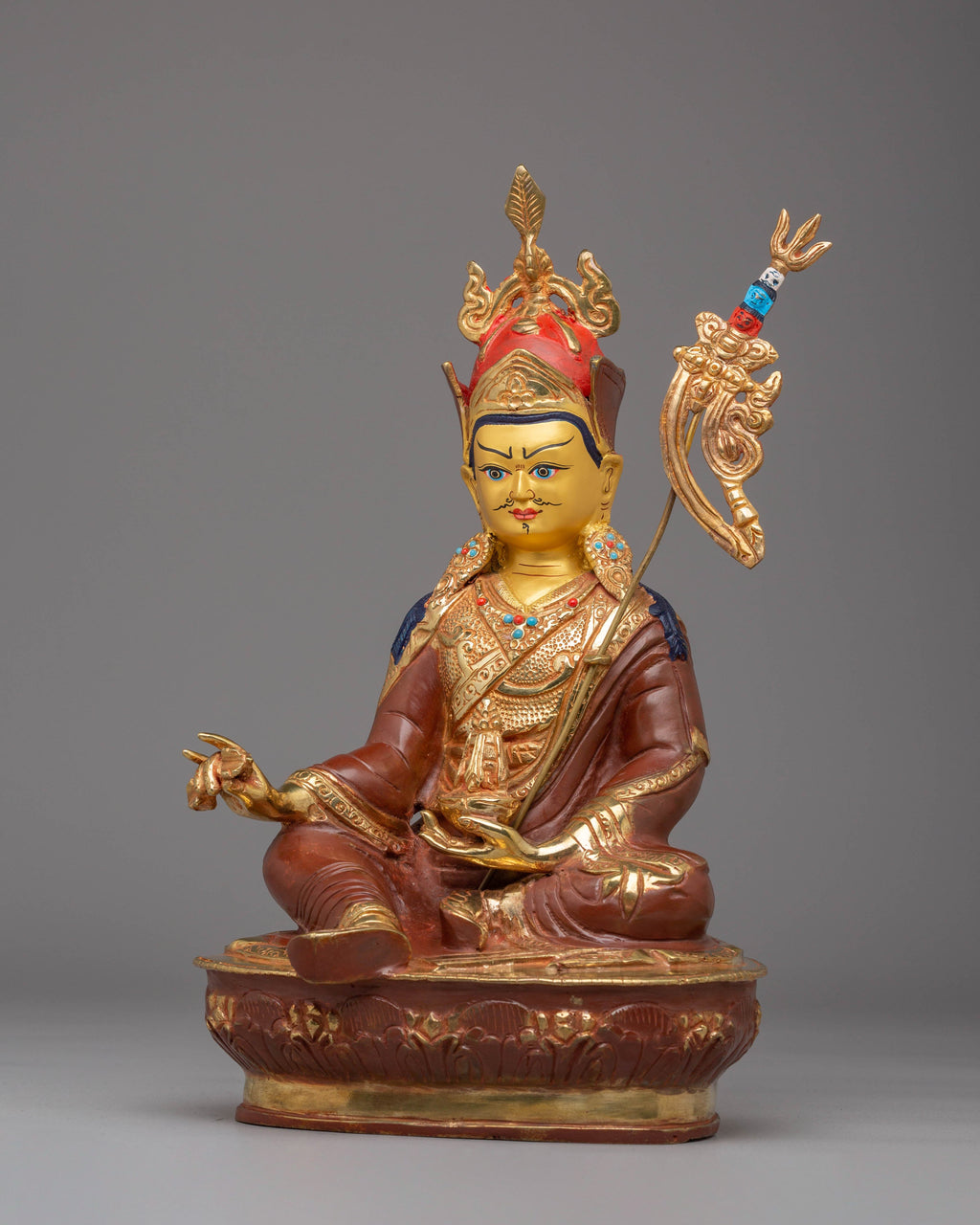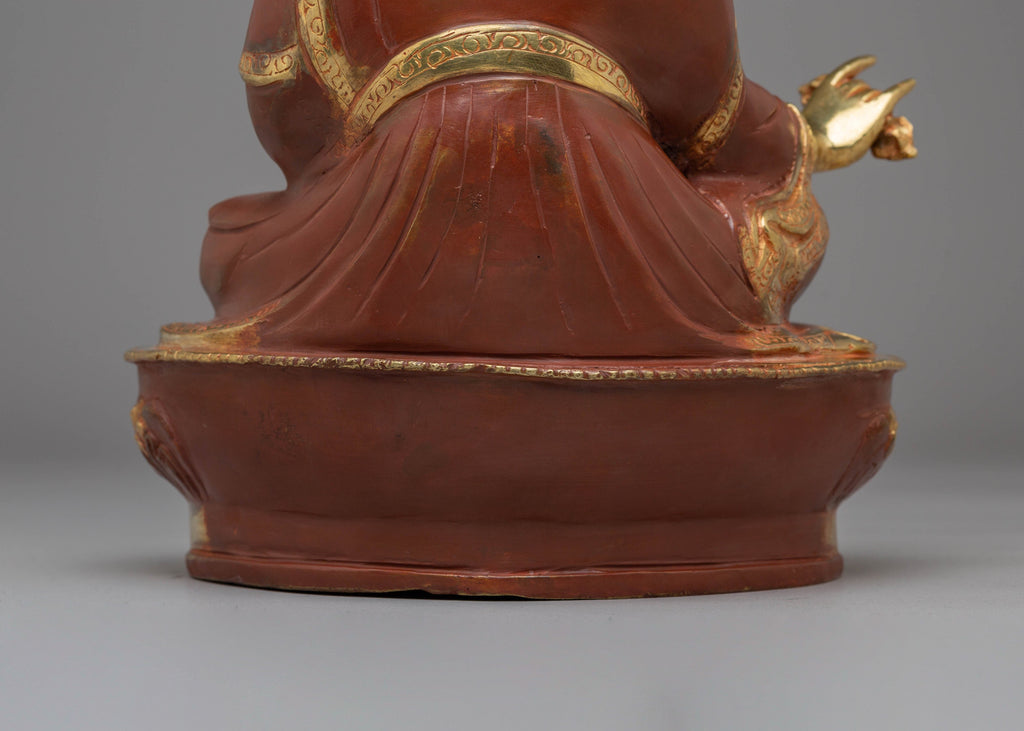 The statue's design features Guru Padmasambhava seated on a lotus base, signifying purity and spiritual awakening. His right hand holds a vajra, representing indestructible power, while his left hand cradles a skull cup filled with the nectar of wisdom. The elaborate crown and flowing robes are adorned with gemstones, enhancing the statue’s sacred aura. The 24K gold plating adds a divine radiance, emphasizing the statue’s spiritual significance. This statue is not just a beautiful piece of art but also a potent symbol of transformation and spiritual growth.