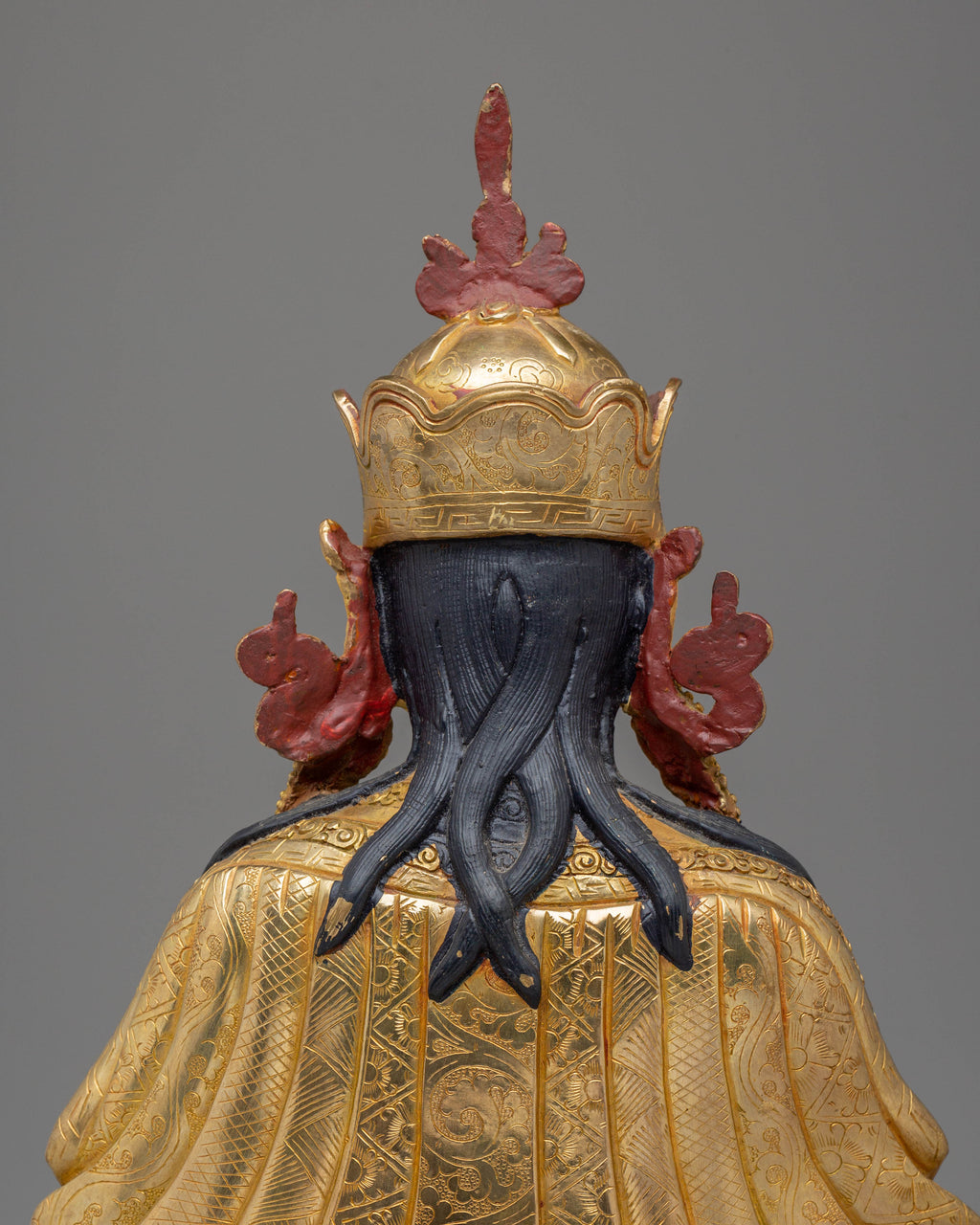 The design of the Guru Tsokye Dorje Statue captures the powerful energy of the deity, with Guru Tsokye Dorje seated in a dignified posture, embodying tranquility and enlightenment. The copper body offers a rich, grounding presence, while the 24K gold gilding adds an aura of purity and divine energy. The acrylic colors bring vivid life to the robes and details of the statue, highlighting its intricate craftsmanship and enhancing the spiritual beauty of the piece. The combination of these materials ensures the statue radiates both visual elegance and profound symbolism.