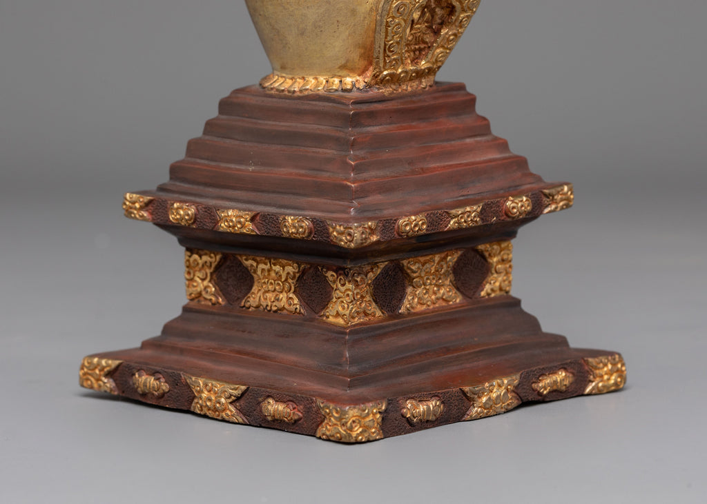 The detailed motifs around the stupa's body express symbolic elements found in sacred Himalayan architecture. Each tier represents a stage of awakening, while the pinnacle embodies the refined elegance of the path to higher wisdom. Inside the stupa is a symbolic representation of a deity, traditionally believed to bestow protective blessings. This inner sacred element is part of what gives a stupa its spiritual significance, serving as a vessel of devotion that channels the essence of enlightened presence.