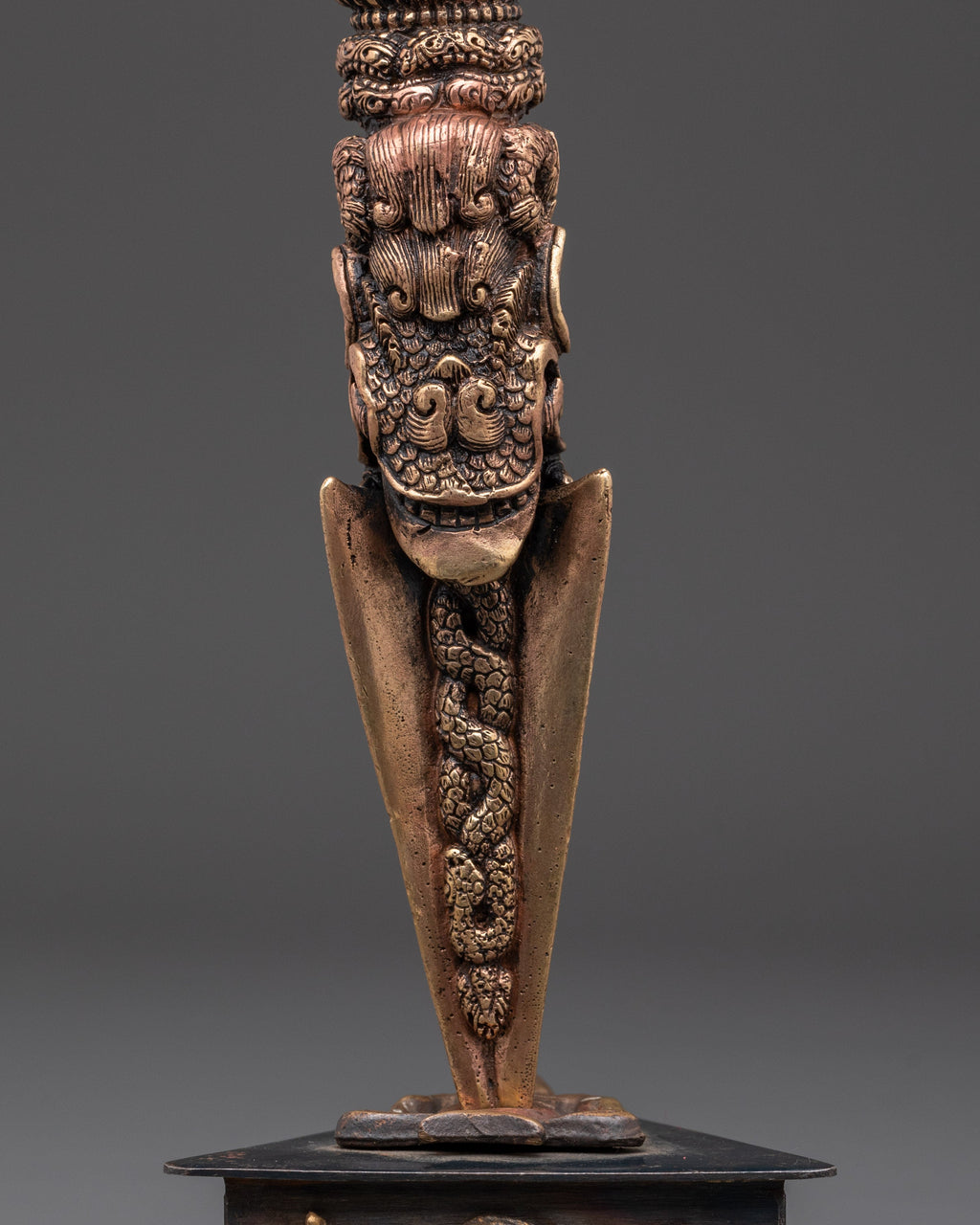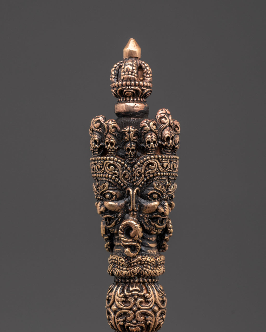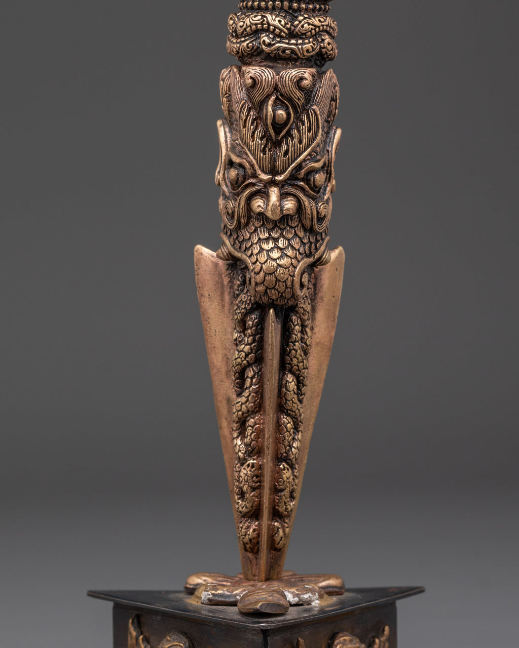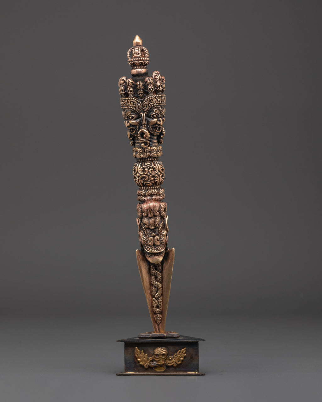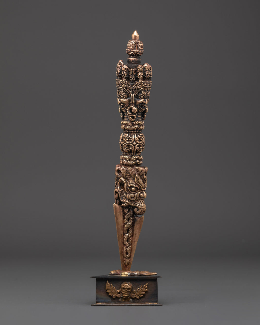 Each aspect of this Phurba is meaningful. The copper represents purity and spiritual conductivity, while the iron base anchors the energy to the earth. The blade's three sided shape symbolizes the transcending of attachment, ignorance, and repulsion. This dagger, meticulously crafted by Himalayan artisans, is suitable for personal meditation rituals, protective rites, and as a strong complement to a sacred altar. Its weight and balance make it both a gorgeous ornament and a useful ceremonial tool.