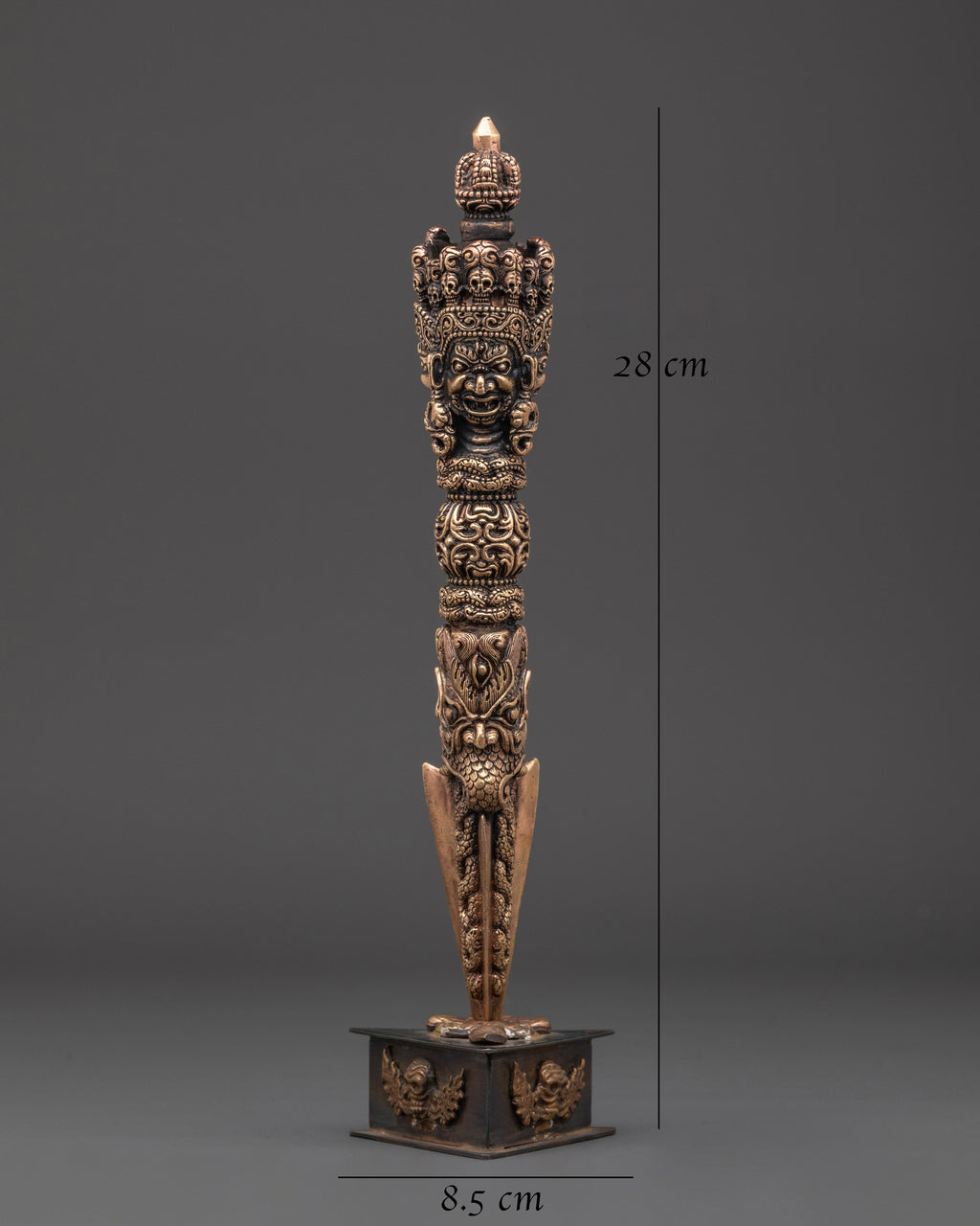 The handcrafted Himalayan Tibetan Phurba Dagger is a sacred ritual tool with profound roots in Tibetan Buddhism's esoteric traditions. This spiritually charged dagger, measuring 28cm tall by 8.5cm wide and weighing 1.21kg, is precisely crafted from copper with an iron base to represent strength, anchoring, and change. The Phurba, traditionally associated with Vajrakilaya the ferocious deity who dispels obstacles is said to channel high vibratory energy for dispelling negativity and grounding spiritual force.