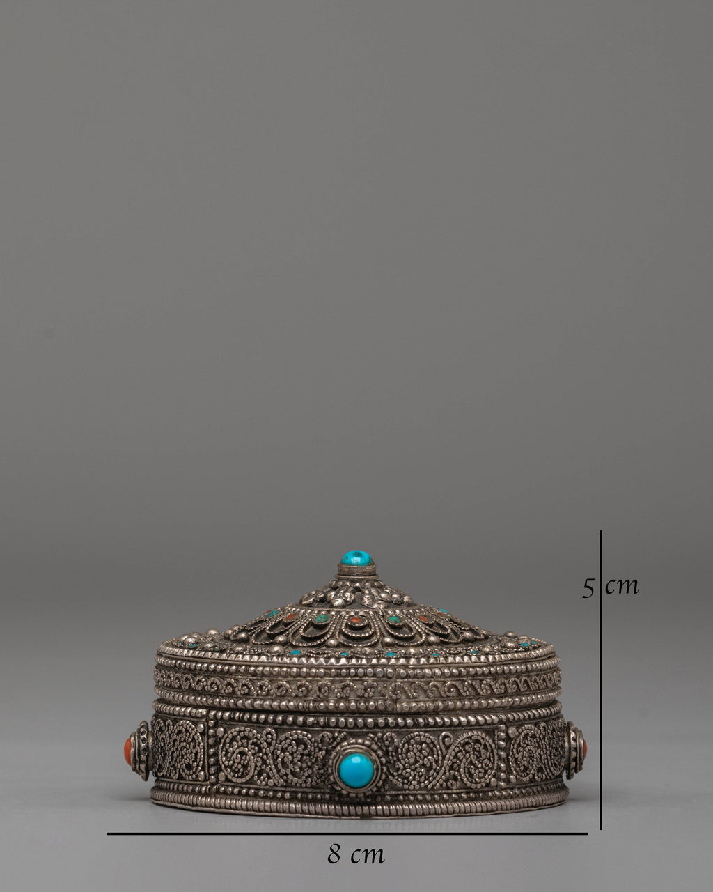 The Handcrafted Jewelry Box is an elegant and practical piece designed to store your precious jewelry in style. Measuring 5cm in height and 8cm in width, and weighing only 0.13kg, this box is crafted from silver and adorned with semi-precious stones, including coral and turquoise. These stones are renowned for their beauty and metaphysical properties, with coral symbolizing vitality and protection, while turquoise is known for its healing and protective qualities. The combination of these elements gives this jewelry box a unique and sacred aura, making it a perfect addition to any collection or as a thoughtful gift.