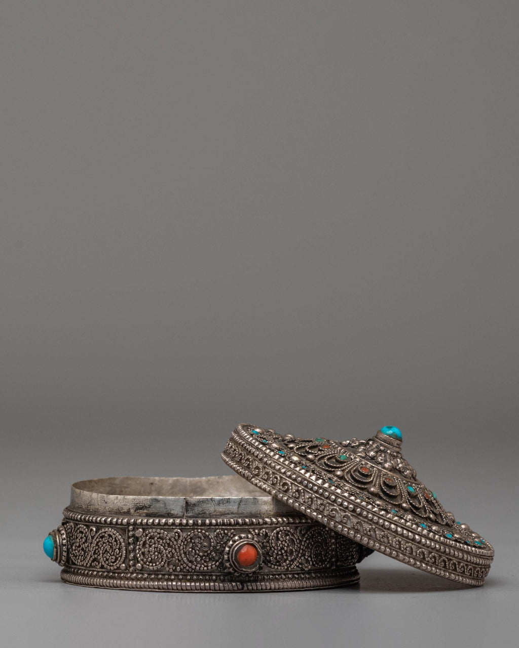The silver jewelry box is designed with intricate detailing, featuring elegant motifs and the calming colors of coral and turquoise. The semi-precious stones are carefully set into the box, highlighting its beauty and spiritual significance. The box's design is not only aesthetically pleasing but also functional, offering a secure, beautiful place to keep rings, necklaces, or other valuable trinkets. The silver finish gives the box a timeless and sophisticated appearance, making it suitable for both modern and traditional spaces.
