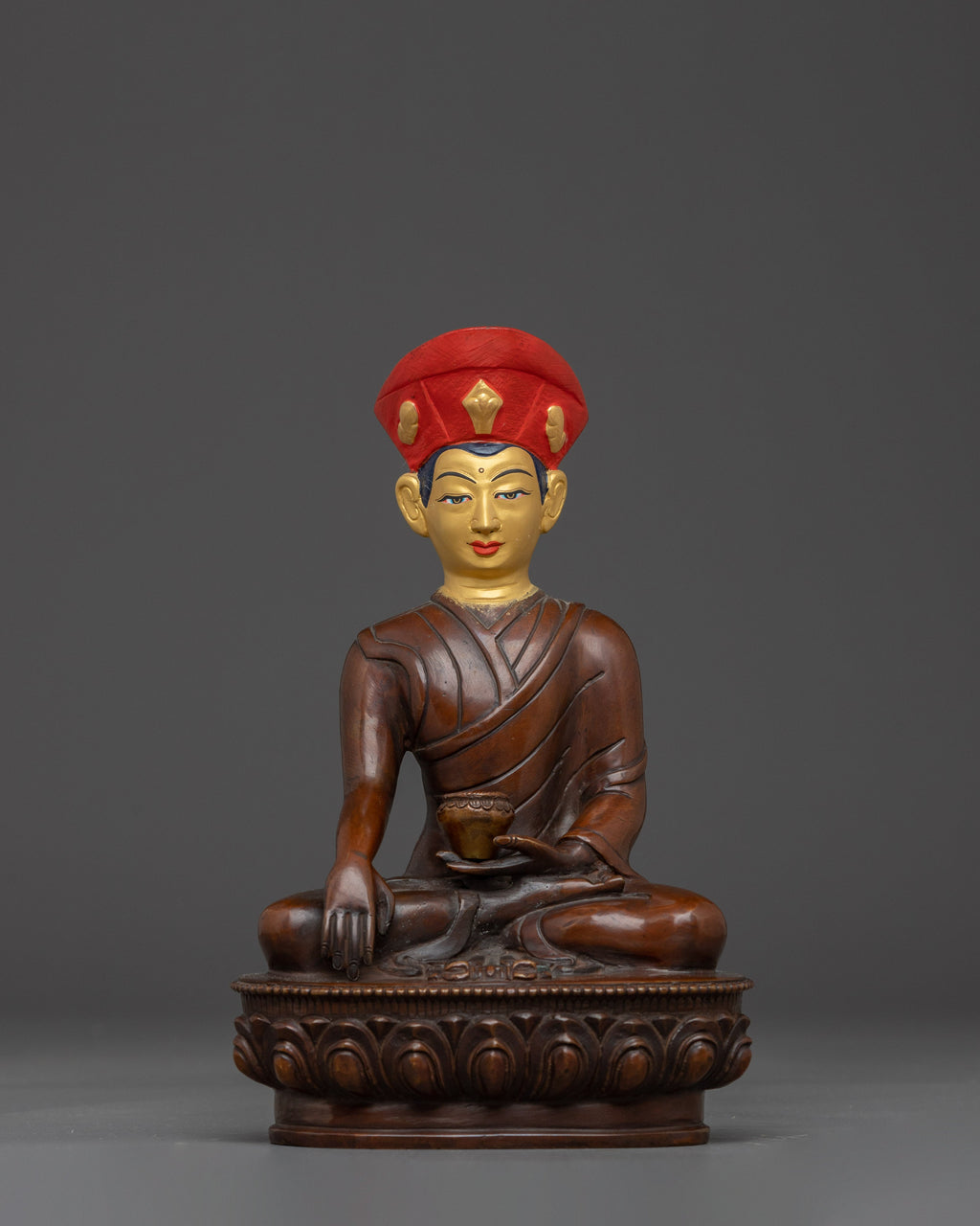 This handcrafted Jigten Sumgon sculpture depicts the renowned Tibetan Buddhist master Jigten Sumgon, an essential figure in the Drikung Kagyu tradition. The statue, 20.5cm tall and weighing 1.23kg, depicts Jigten Sumgon seated in meditation, wearing his distinctive red hat and holding an alms bowl, exuding knowledge and compassion. The statue is ideal for personal shrines, temples, or meditation areas, symbolizing the profound teachings of the lineage.