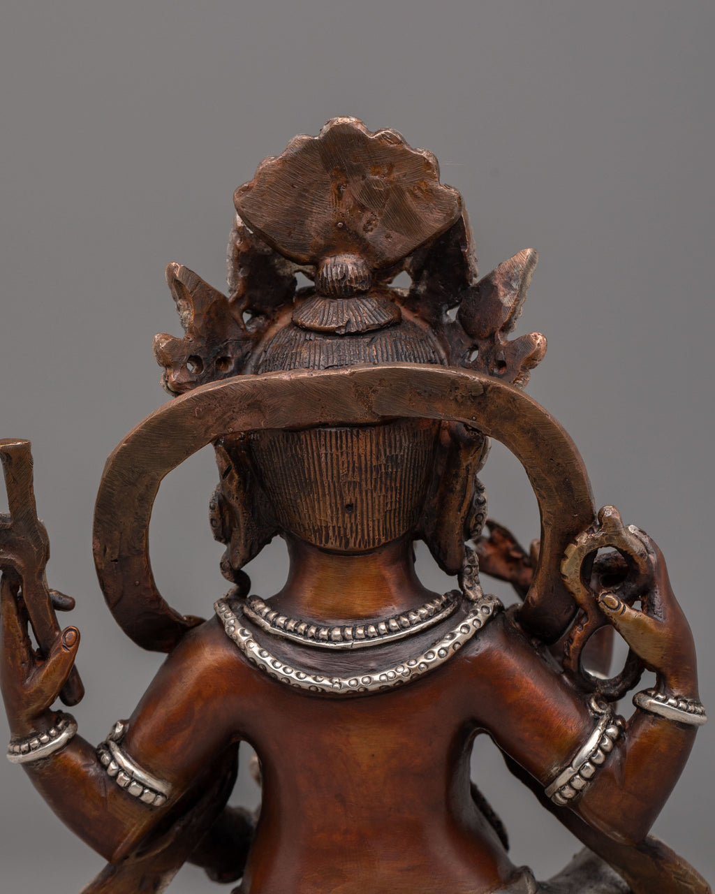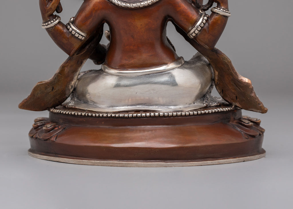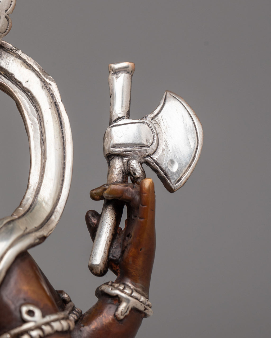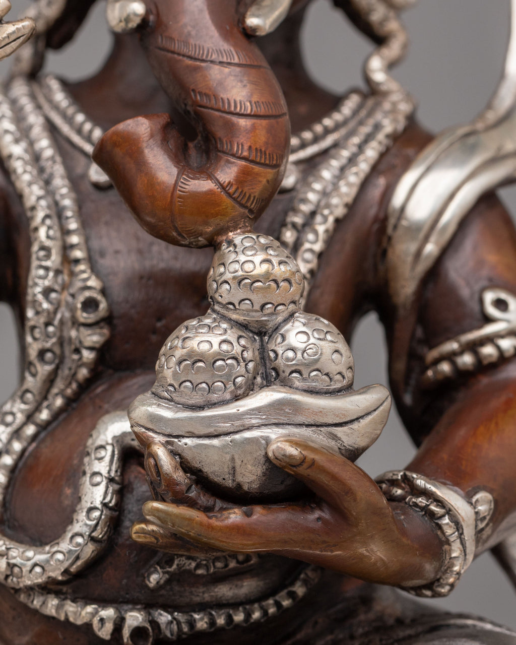 The statue represents Lord Ganesh, the remover of obstacles and the deity of wisdom, prosperity, and good fortune. Detailed craftsmanship highlights his iconic features elephant head, potbelly, seated posture, and symbolic attributes reflecting traditional Hindu artistry. The oxidized copper finish combined with silver plating adds depth, character, and a sacred aura, enhancing the spiritual presence of the statue.