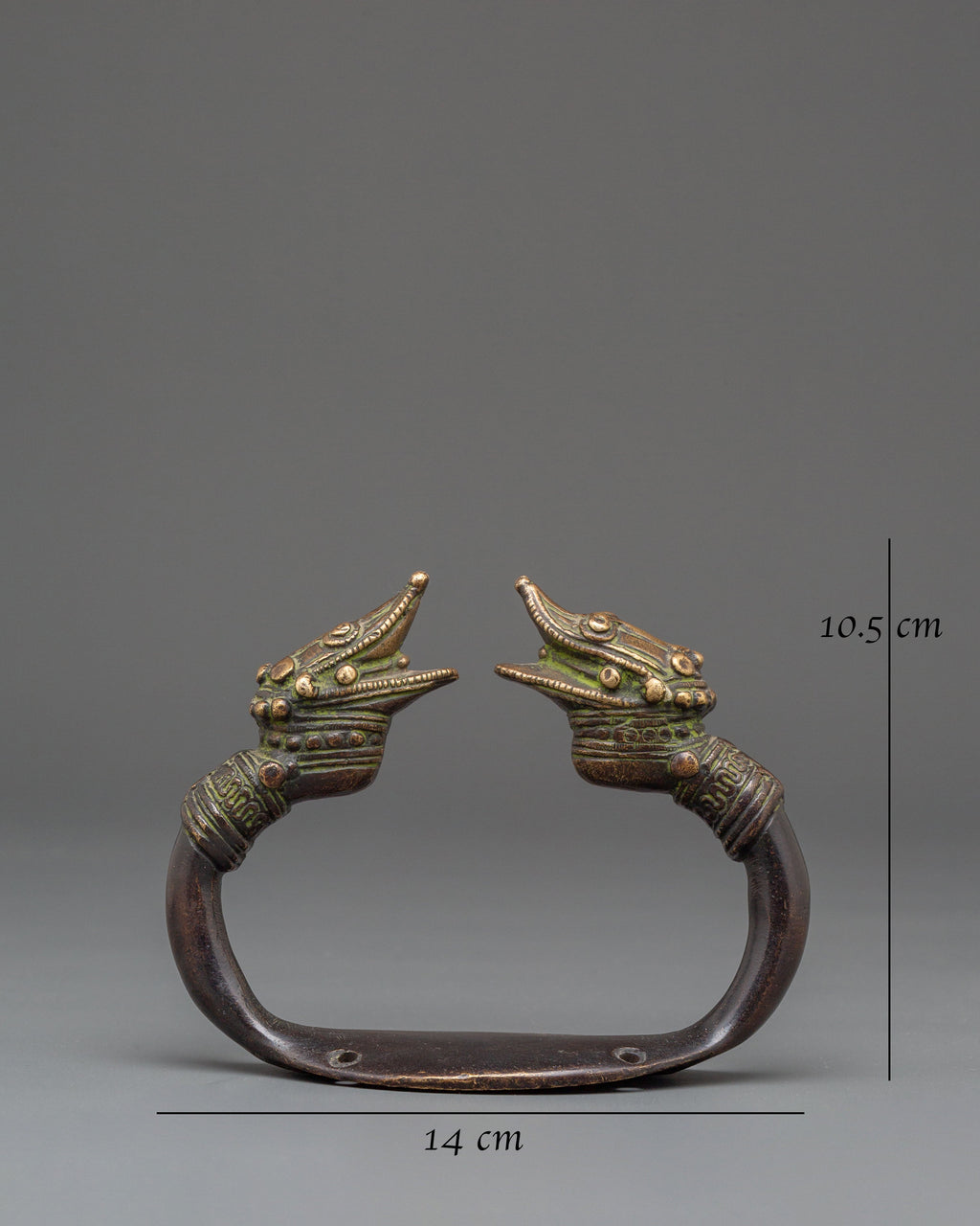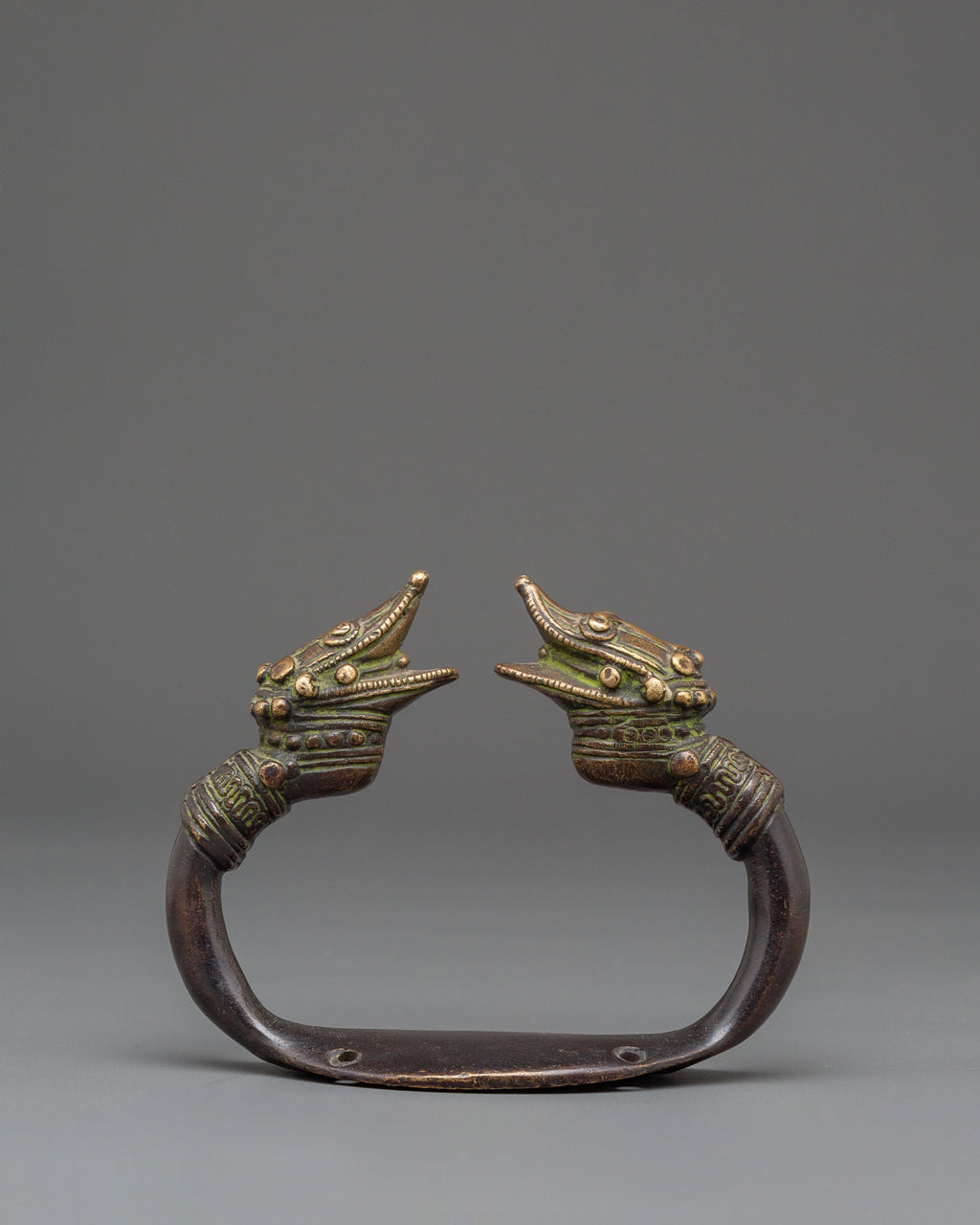 This handcrafted brass makara door handle showcases the artistry of Himalayan metalwork, featuring mirror-symmetrical dragonhead terminals. Measuring 14 centimeters in width and 10.5 centimeters in height, and weighing 0.61 kilograms, it features intricately detailed dragon heads that emerge from banded necks with open mouths symbolizing strength and protection. In Buddhist and Hindu mythology, the makara, a legendary aquatic creature, represents auspicious energy and guardianship, making it a meaningful motif in temple and palace design. The finely detailed scales, flowing manes, and crowned tops reflect generations of skilled craftsmanship, while the warm brass tones highlight the graceful curve that connects the two guardian figures.
