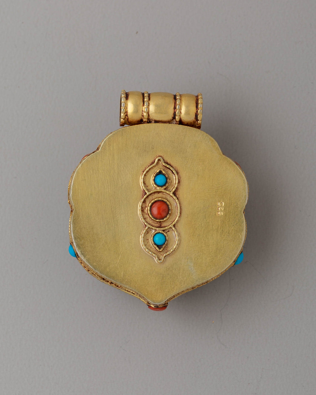 The design of the Manjushri Ghau Box Locket is rich with symbolism. Manjushri, depicted on the locket, embodies wisdom, symbolized by the flaming sword he holds. The coral and turquoise accents further enhance the locket, with coral symbolizing vitality and protection, and turquoise being known for its healing properties. The gold plating brings an aura of sacredness and purity, highlighting the importance of wisdom, meditation, and inner peace that Manjushri embodies.