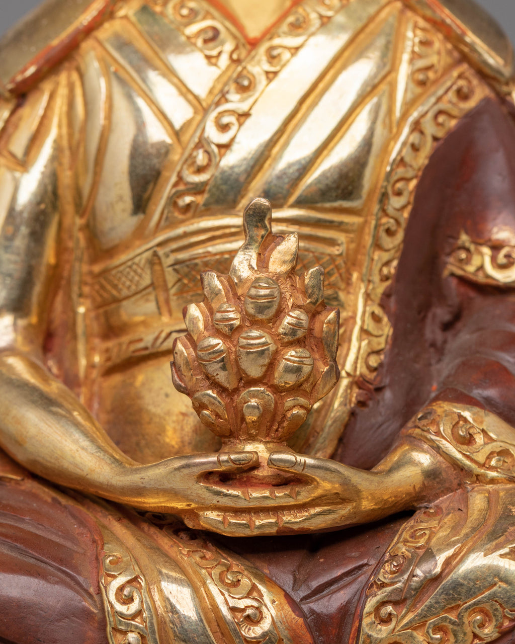 The design of the Marpha statue captures the essence of his compassionate nature and dedication to the Buddhist path. The acrylic colors highlight the intricate details of his robes, facial features, and posture, showcasing the traditional Tibetan artistic style. The 24K gold plating adds a luminous finish, symbolizing the purity and wisdom of the teachings Marpha imparted to his followers. His peaceful expression and meditative posture invite practitioners to reflect on the path of enlightenment, compassion, and spiritual growth.
