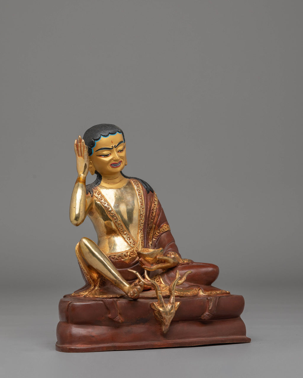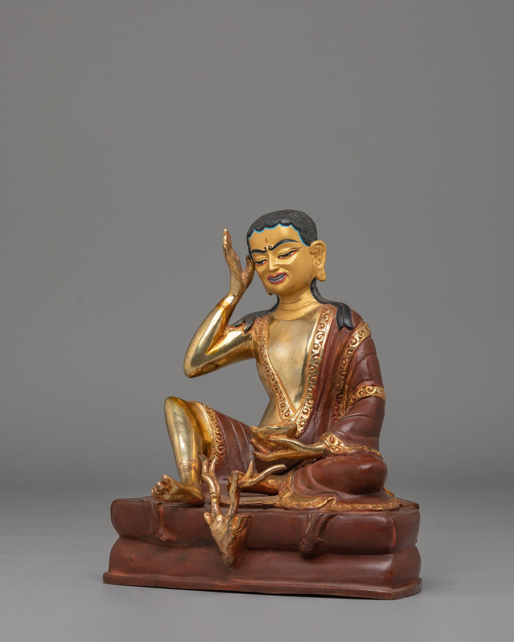The intricate features of Milarepa are highlighted by delicate acrylic coloring, which also adds depth and vibrancy to the statue. The gold plating, combined with the copper body, creates a stunning contrast that emphasizes the statue's intricate details. Every curve and expression is meticulously crafted to capture the essence of Milarepa's wisdom and compassion.