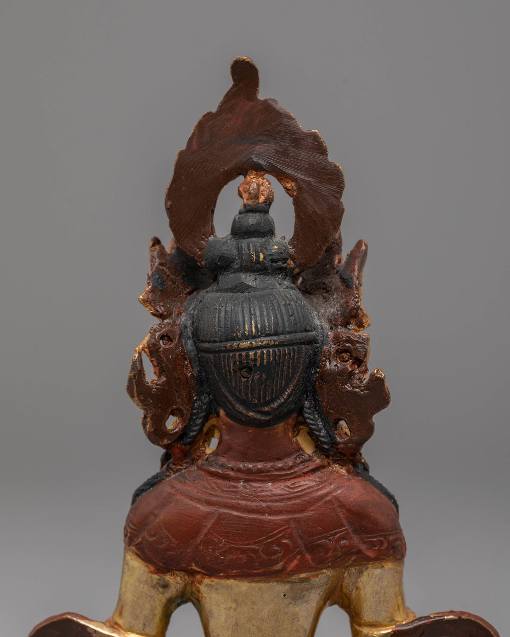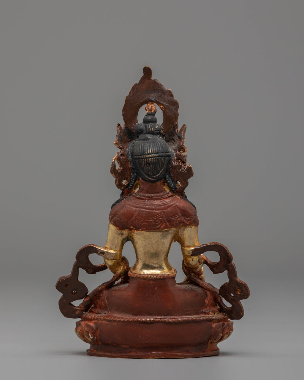 The Handcrafted Mitrugpa Copper Statue is a beautifully crafted representation of Mitrugpa, a powerful deity in Tibetan Buddhism known for his fierce protection and ability to overcome obstacles. Measuring 16 cm in height and 11 cm in width, and weighing 0.54 kg, this statue is made from a high-quality copper body with 24K gold gilding and detailed acrylic color accents. Its powerful and intricate design captures the essence of Mitrugpa's protective nature, making it an ideal addition to your altar, meditation space, or collection of sacred objects.