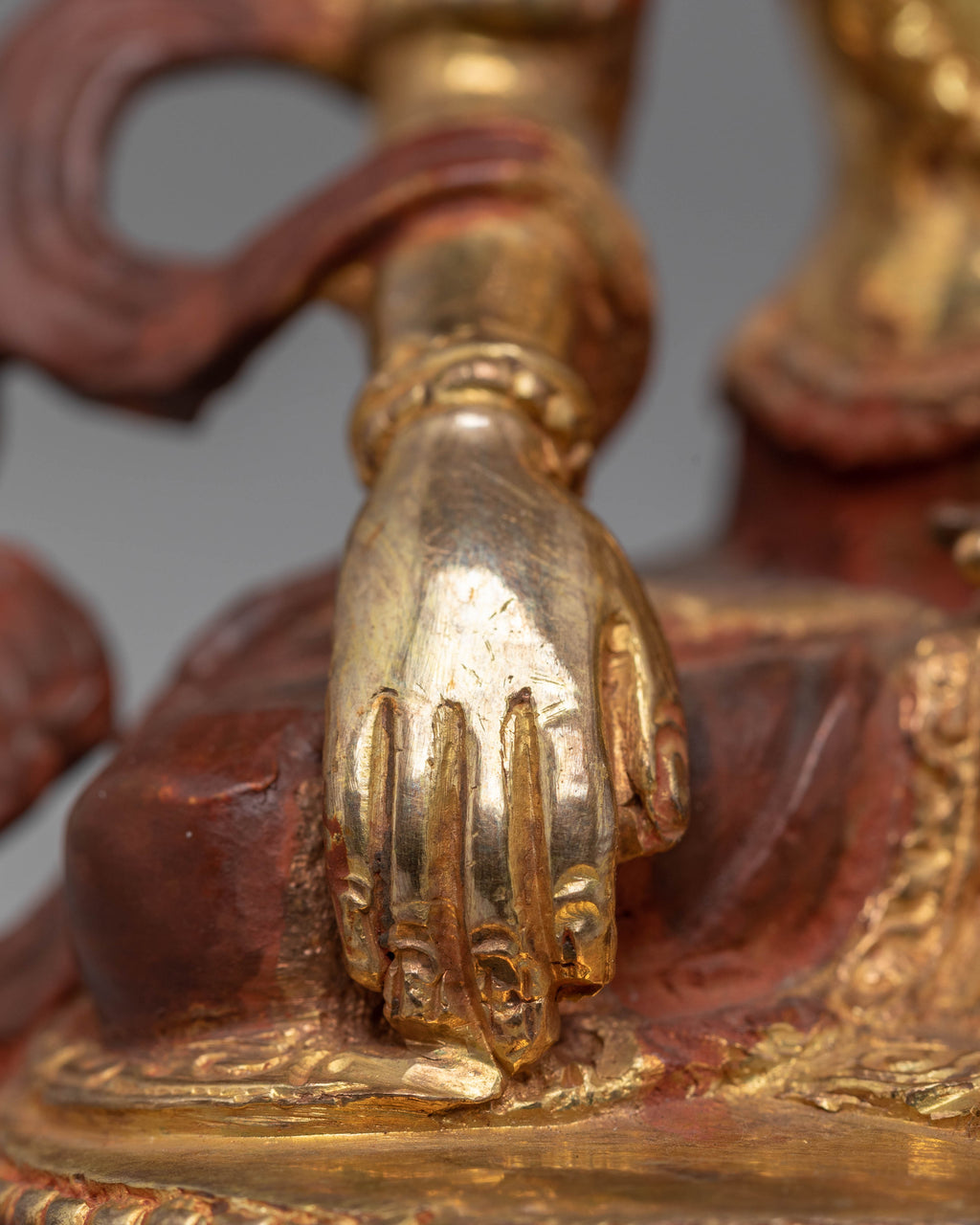 The Mitrugpa statue features the deity in a traditional stance, symbolizing strength, protection, and spiritual power. The 24K gold gilding adds a sacred, luminous quality to the figure, while the acrylic colors enhance the fine details of Mitrugpa's attire, expression, and symbolic objects. The copper body gives the statue a timeless, earthy tone that reflects the power and stability of this fierce protector. This finely crafted statue is not only a visual masterpiece but also a powerful tool for invoking protection and spiritual clarity.