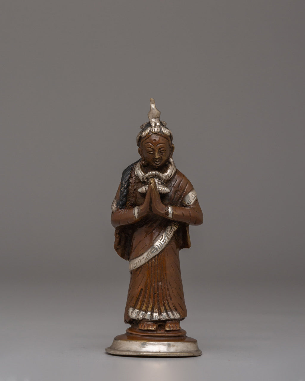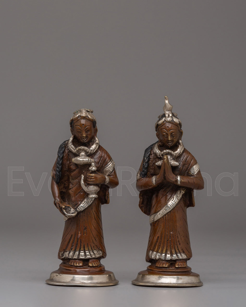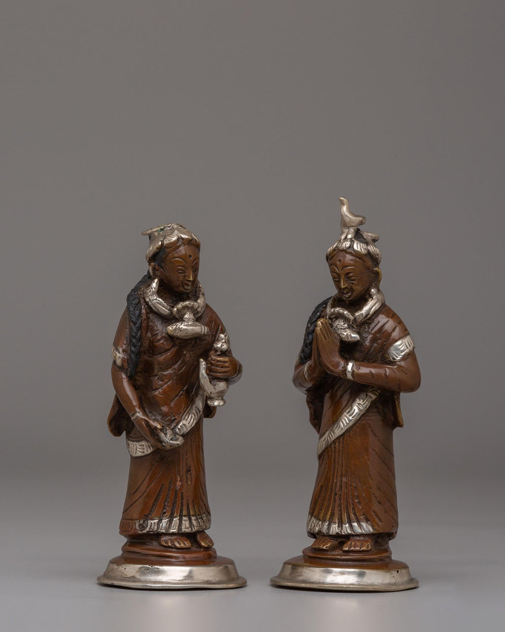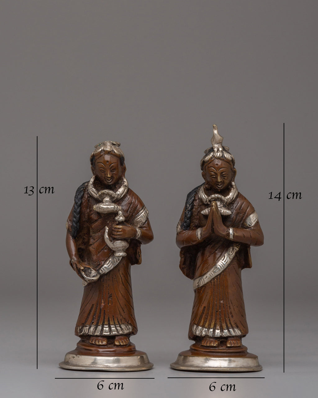 The Newari Ladies statues beautifully depict the cultural and spiritual essence of Nepal’s Newar community, celebrated for its rich heritage and artistry. These handcrafted figures, made from oxidized brass and adorned with silver plating, reflect the traditional attire and roles of Newari women, often central to ceremonial and ritualistic practices. Standing 13.5 cm tall and 5.5 cm wide, the statues exhibit intricate detailing in their clothing, jewelry, and postures, symbolizing reverence, devotion, and abundance. Perfect for both spiritual and decorative purposes, these statues capture the timeless charm of Nepalese craftsmanship and cultural significance.