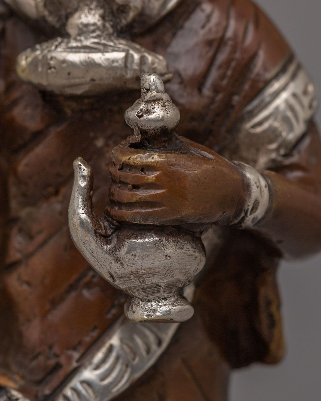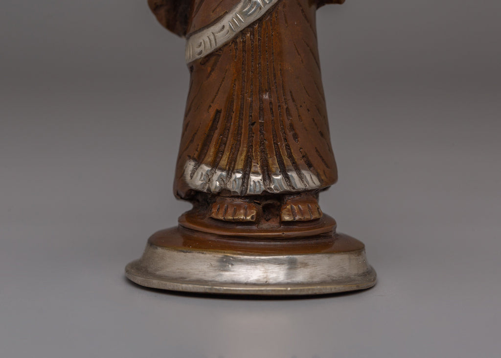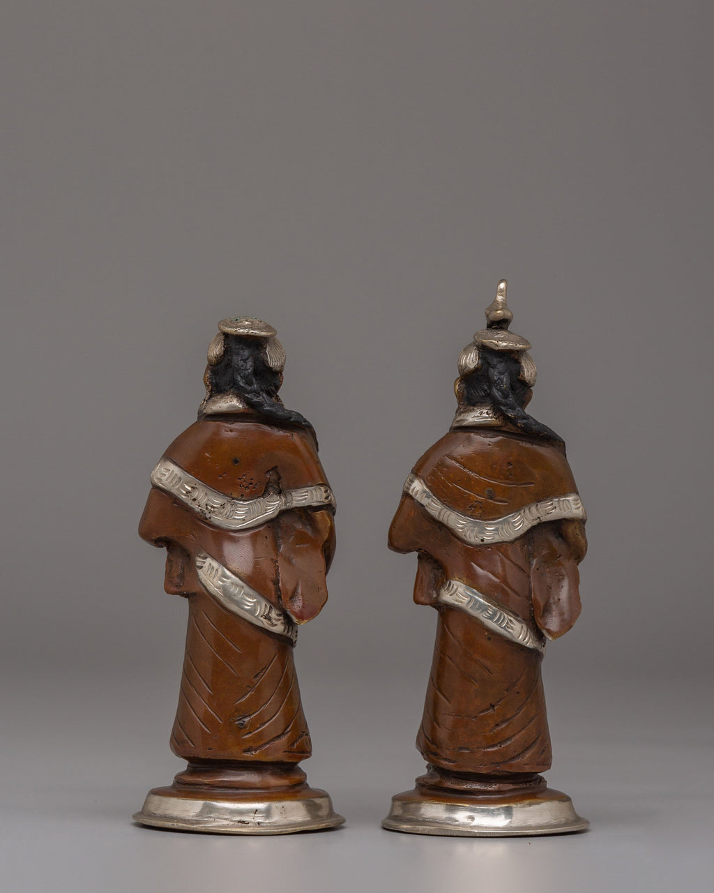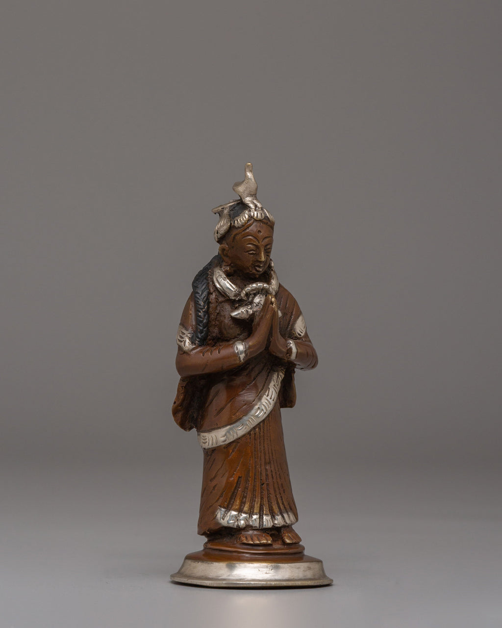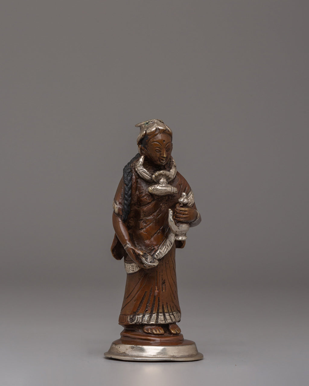 The Newari Ladies statues beautifully depict the cultural and spiritual essence of Nepal’s Newar community, celebrated for its rich heritage and artistry. These handcrafted figures, made from oxidized brass and adorned with silver plating, reflect the traditional attire and roles of Newari women, often central to ceremonial and ritualistic practices. Standing 13.5 cm tall and 5.5 cm wide, the statues exhibit intricate detailing in their clothing, jewelry, and postures, symbolizing reverence, devotion, and abundance. Perfect for both spiritual and decorative purposes, these statues capture the timeless charm of Nepalese craftsmanship and cultural significance.