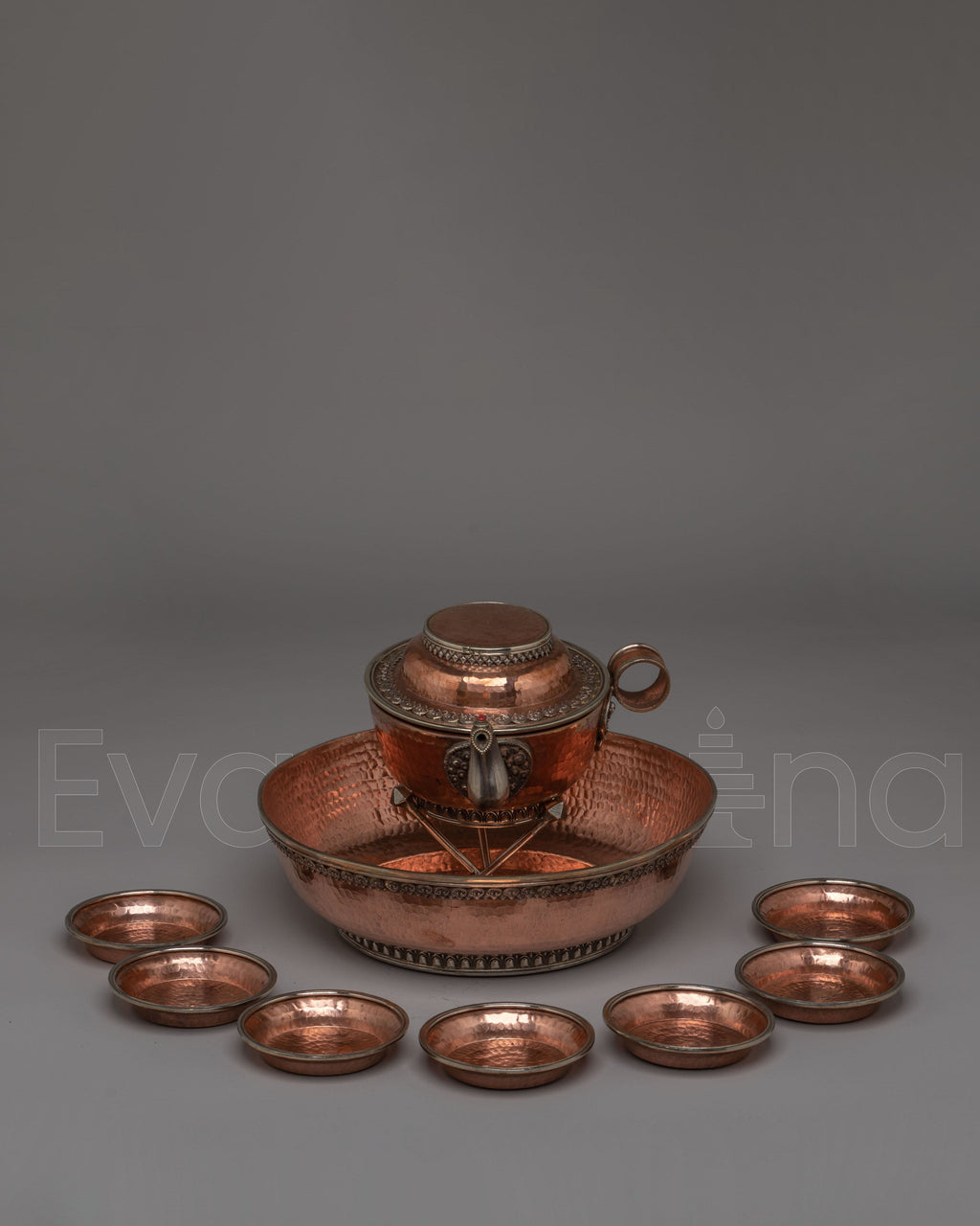 The design of this offering water bowl set is rich with spiritual meaning and symbolism. The large plate serves as a sacred space for offerings, while the pot, often used in Tibetan rituals, holds water for purification, creating a flow of positive energy. The small plates are used to offer water to various deities and spirits, embodying purity, serenity, and the continuity of spiritual offerings. The combination of copper and white metal ensures both aesthetic beauty and durability, making this set a timeless piece for spiritual practices.