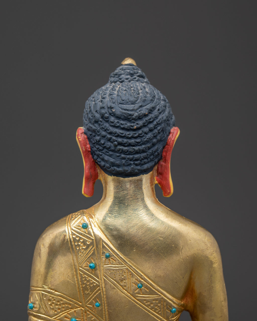 The Handcrafted Radiant Artwork of Buddha Shakyamuni symbolizes the Buddha's profound teachings and the path to spiritual awakening. This handcrafted statue is 7.1" (Height) x 5.1" (Base) and weighs 0.90 kg. It is made of copper, adorned with 24K gold gilding, and enhanced with gold and acrylic paints. This sacred statue, crafted by expert Nepalese artisans, embodies the craftsmanship of Himalayan Buddhism, making it an inspirational addition to altars, meditation spaces, or holy collections.