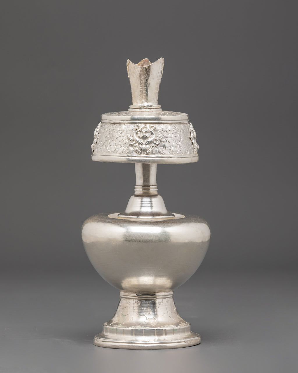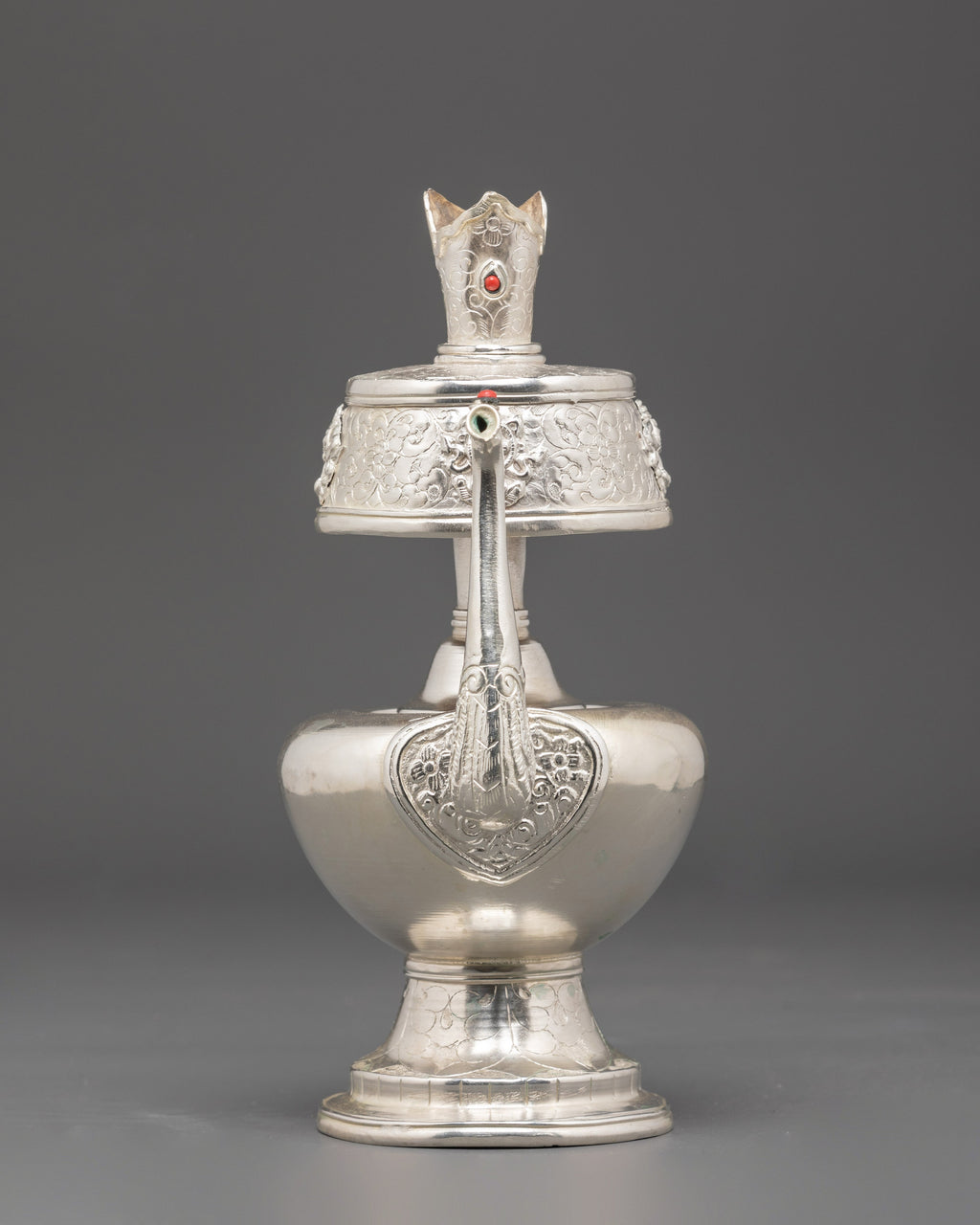 The body of the bhumba features graceful hand-carved details that reflect traditional Tibetan symbolism, including patterns, protective designs, and auspicious elements. The silver-plated finish enhances every detail, creating a luminous surface that represents purity and spiritual clarity. Each design element expresses devotion, craftsmanship, and the spiritual beauty of Tibetan culture.