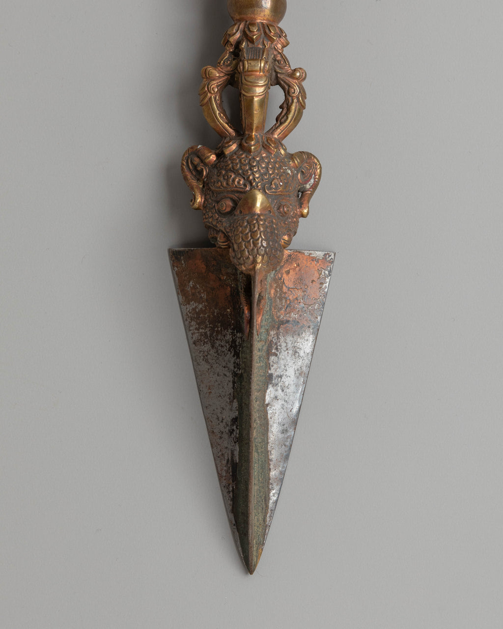 The ceremonial dagger (Sanskrit: Kila; Tibetan: phurba) is essential for expelling evil and is considered particularly effective in neutralizing the forces obstructing Tantric Buddhist practice. It has ancient origins, first appearing in the Indian Rig Veda as the core blade of the vajra used by Indra to destroy the primordial cosmic snake Vritra. Kila, derived from Sanskrit, was most likely associated with Vedic sacrifices. Meditation on the Vajrakila Tantra, an early Indian scripture first promoted in Tibet in the eighth century by Padmasambhava, one of the founding teachers of Tibetan Buddhism, is used to invoke the three-headed Vajrakila Buddha.